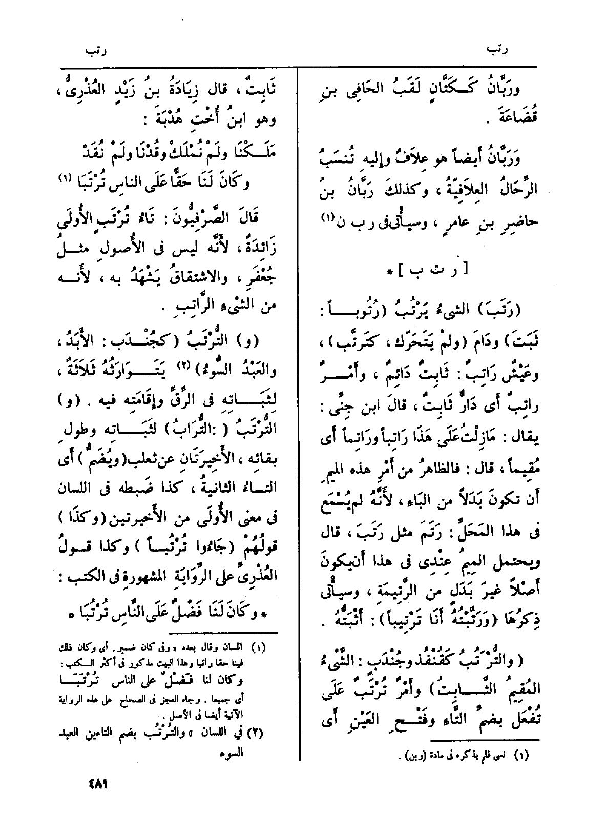 : (رَتَبَ) الشيءُ يَرْتُبُ (رُتُوباً: ثَبَتَ) ودَامَ (ولمْ يَتَحَرّك، كتَرتَّب) ، وعَيْشٌ رَاتِبٌ: ثَابِتٌ دَائِمٌ، وأَمْرٌ راتِبٌ أَي دَارٌّ ثَابِتٌ، قَالَ ابْن جِنِّي: يُقَال: مَا زِلْتُ عَلَى هَذَا رَاتِباً ورَاتِماً أَي مُقِيماً، قَالَ: فالظاهرُ من أَمْرِ هَذِه الميمِ أَن تكونَ بَدَلاً من البَاءِ، لأَنَّهُ لم يُسْمَع فِي هَذَا المَحَلِّ: رَتَمَ مثل رَتَبَ، قَالَ وَيحْتَمل المِيمُ عِنْدِي فِي هَذَا أَن يكونَ أَصْلاً غيرَ بَدَلٍ من الرَّتِيمَةِ، وسيأْتي ذِكرُهَا (وَرَتَّبْتُهُ أَنَا تَرْتِيباً) أَثْبَتُّهُ.