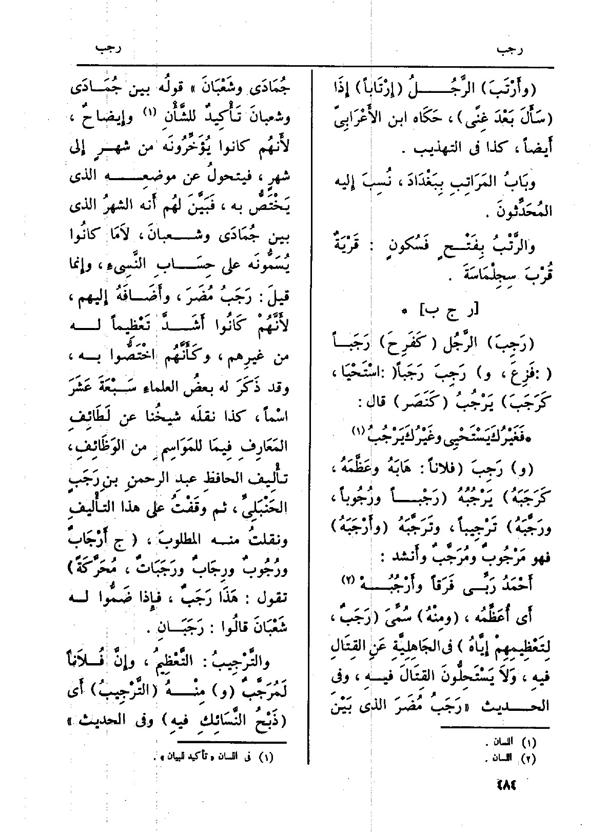 أَي أُعَظِّمُه، (ومِنْهُ) سُمِّيَ (رَجَبٌ، لِتَعْظِيمِهِمْ إِيَّاهُ) فِي الجَاهِلِيَّةِ عَنِ القِتَالِ فيهِ، وَلاَ يَسْتَحِلُّونَ القِتَالَ فيهِ، وَفِي الحَدِيث (رَجَبُ مُضَرَ الَّذِي بَيْنَ جُمَادَى وشَعْبَانَ) قولُه بَين جُمادَى وشعبانَ تَأْكِيدٌ للشَّأْنِ وإِيضاحٌ، لأَنهُم كَانُوا يُؤَخِّرُونَه من شهرٍ إِلى شهرٍ، فيتحولُ عَن موضعِه الَّذِي يَخْتَصُّ بِهِ، فَبَيّنَ لهُم أَنه الشهرُ الَّذِي بَين جُمَادَى وشعبانَ، لاَ مَا كانُوا يُسَمّونَه على حِسَابِ النَّسِيءِ، وإِنما قيلَ: رَجَبُ مُضَرَ، وأَضَافَهُ إِليهم، لأَنَّهُمْ كَانُوا أَشَدَّ تَعْظِيماً لَهُ من غيرهِم، وكَأَنَّهُم اخْتَصُّوا بِهِ، وَقد ذَكَرَ لَهُ بعضُ العلماءِ سَبْعَةَ عَشَرَ اسْماً، كَذَا نقلَه شيخُنَا عَن لَطَائِفِ المَعَارِفِ فِيمَا للمَوَاسِمِ من الوَظَائِفِ، تأْلِيف الحافظِ عبد الرحمنِ بن رَجَبٍ الحَنْبَلِيِّ، ثمَّ وَقَفْتُ على هَذَا التأْليفِ ونقلتُ مِنْهُ المطلوبَ، (ج أَرْجَابٌ ورُجُوبٌ ورِجَابٌ ورَجَبَاتٌ، مُحَرَّكَةً) تَقول: هَذَا رَجَبٌ، فإِذا ضَمُّوا لَهُ شَعْبَانَ قالُما: رَجَبَانِ.