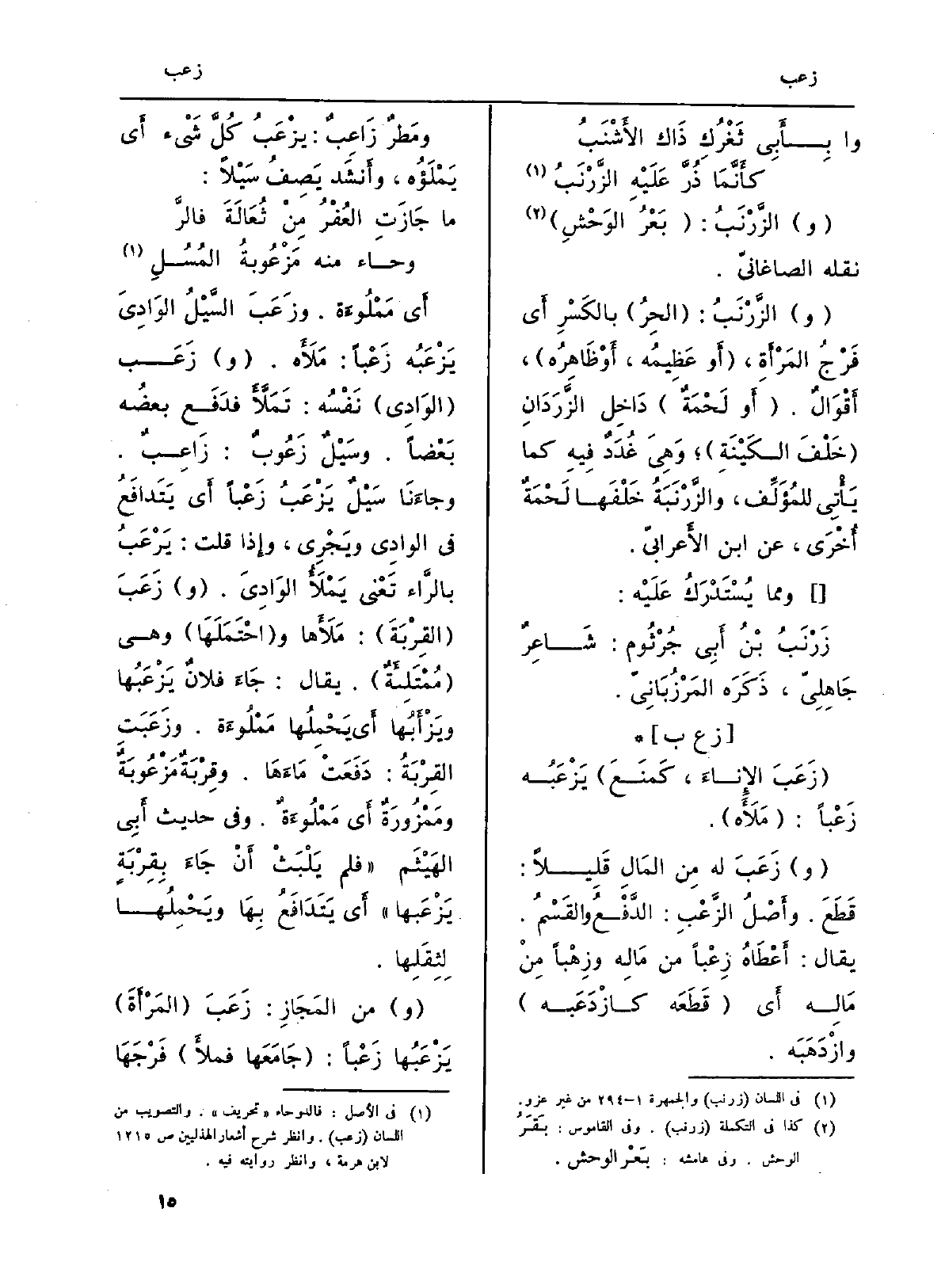 أَي مَمْلُوءَة: وزَعَبَ السَّيْلُ الوَادِيَ يَزْعَبُه زَعْباً: مَلَأَه. (و) زَعَب (الوَادِي) نَفْسُه: تَمَلَّأَ فدَفَع بعضُه بَعْضاً. وسَيْلٌ زَعُوبٌ: زَاغِبٌ. وجاءَنَا سَيْلٌ يَزْعَبُ زَعْباً أَي يَتَدافَعُ فِي الْوَادي ويَجْرِي، وإِذا قلت: يَرْعَبُ بالرَّاء تَعْنى يَمْلَأُ الوَادِيَ. (و) زَعَبَ (القِرْبَةَ) : مَلَأَها و (احْتَمَلَهَا) وَهِي (مُمْتَلِئَةٌ) . يُقَال: جَاءَ فلانٌ يَزْعَبُها ويَزْأَبُها أَي يَحْمِلُها مَمْلُوءَة. وزَعَبَتِ القِرْبَةُ: دَفَعَت مَاءَها. وقِرْبَةٌ مَزْعُوبَةٌ ومَمْزُورَةٌ أَي مَمْلُوءةٌ. وَفِي حَدِيث أَبِي الهَيْثَم (فَلم يَلْبَثْ أَن جَاءَ بِقِرْبَةٍ يَزْعَبها) أَي يَتَدَافَعُ بِهَا ويَحْملُها لِثِقَلِها.