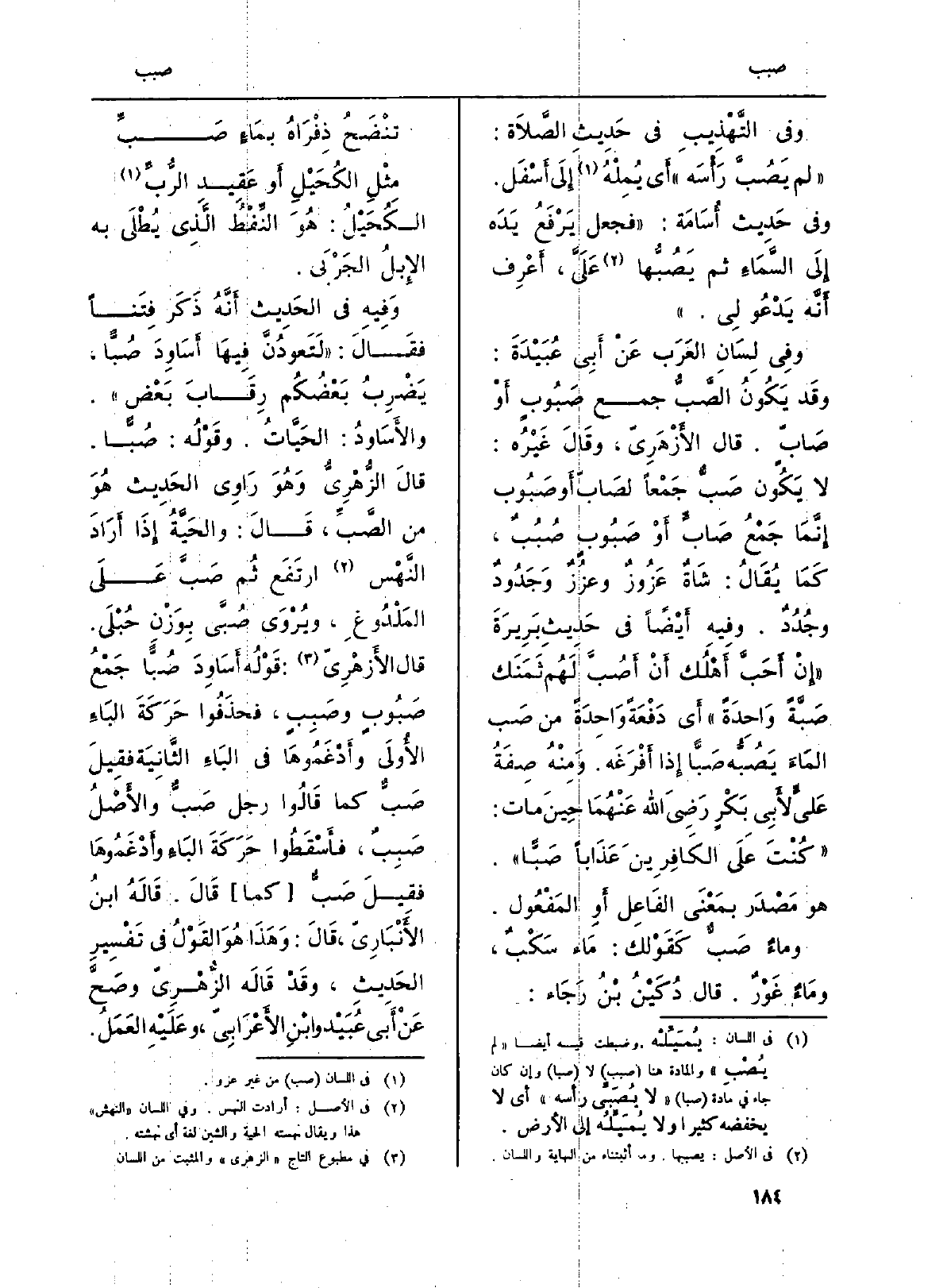 وفِي لِسَانِ العَرَب عَنْ أَبِي عُبَيْدَةَ وقَد يَكُونُ الصَّبُّ جمع {صَبُوبٍ أَوْ} صَابِّ. قَالَ الأَزْهَرِيّ، وقَالَ غَيْرُه: لَا يَكُون صَبٌّ جَمْعاً {لصَابّ أَو} صَبُوب إِنَّمَا جَمْعُ صَابَ أَوْ صَبُوبٍ {صُبُبٌ، كَمَا يُقَالُ: شَاةٌ عَزُوزٌ وعزُزٌ وَجَدُودٌ وجُدُدٌ. وفِيهِ أَيْضاً فِي حَدِيثِ بَرِيرَةَ (إِنْ أَحَبَّ أَهْلُك أَنْ أَصُبَّ لَهُم ثَمَنَك صَبَّةً وَاحِدَةً أَي دَفْعَةً وَاحِدَةً من صَب المَاءَ يَصُبُّه صَبًّا إِذا أَفْرَغَه. وَمِنْهُ صِفَةُ عَليَ لأَبِي بَكْرٍ رَضِيَ الله عَنْهُمَا حِين مَاتَ: (كُنْتَ عَلَى الكَافِرِينَ عَذَاباً صَبًّا) . هُوَ مَصْدَر بمَعْنَى الفَاعِل أَوِ المَفْعُول.