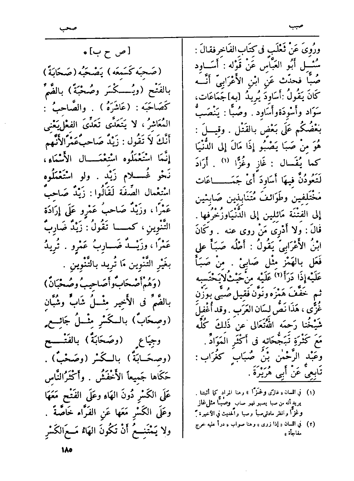 : (صَحِبَه كَسَمِعَه) يَصْحَبُه (صَحَابَةً) بالفَتْح (ويُكسَر وصُحْبَةً) بالضَّمِّ كَصَاحَبَه: (عَاشَرَهُ) . والصَّاحبُ: المُعَاشِرُ، لَا يَتَعَدَّى تَعَدى الفِعْل يَعْنِي أَنَّكَ لَا تَقُول: زَيْدٌ صَاحبٌ عَمْراً لأَنَّهم إِنَّمَا اسْتَعْمَلُوه اسْتِعْمَال الأَسْمَاءِ، نَحْو غُلام زَيْدٍ. وَلَو اسْتَعْمَلُوه اسْتِعْمال الصِّفَة لَقَالُوا: زَيْدٌ صَاحِبٌ عَمْراً، وزَيْدٌ صَاحبُ عَمْرٍ وعَلَى إِرَادَة التَّنْوِينِ، كَمَا تَقُولُ: زَيْدٌ ضَارِبٌ عَمْراً، وزَيْدٌ ضَارِبُ عَمْرَو. تُرِيدُ بغَيْره التَّنْوِين مَا تُرِيد بالتَّنْوِينِ.