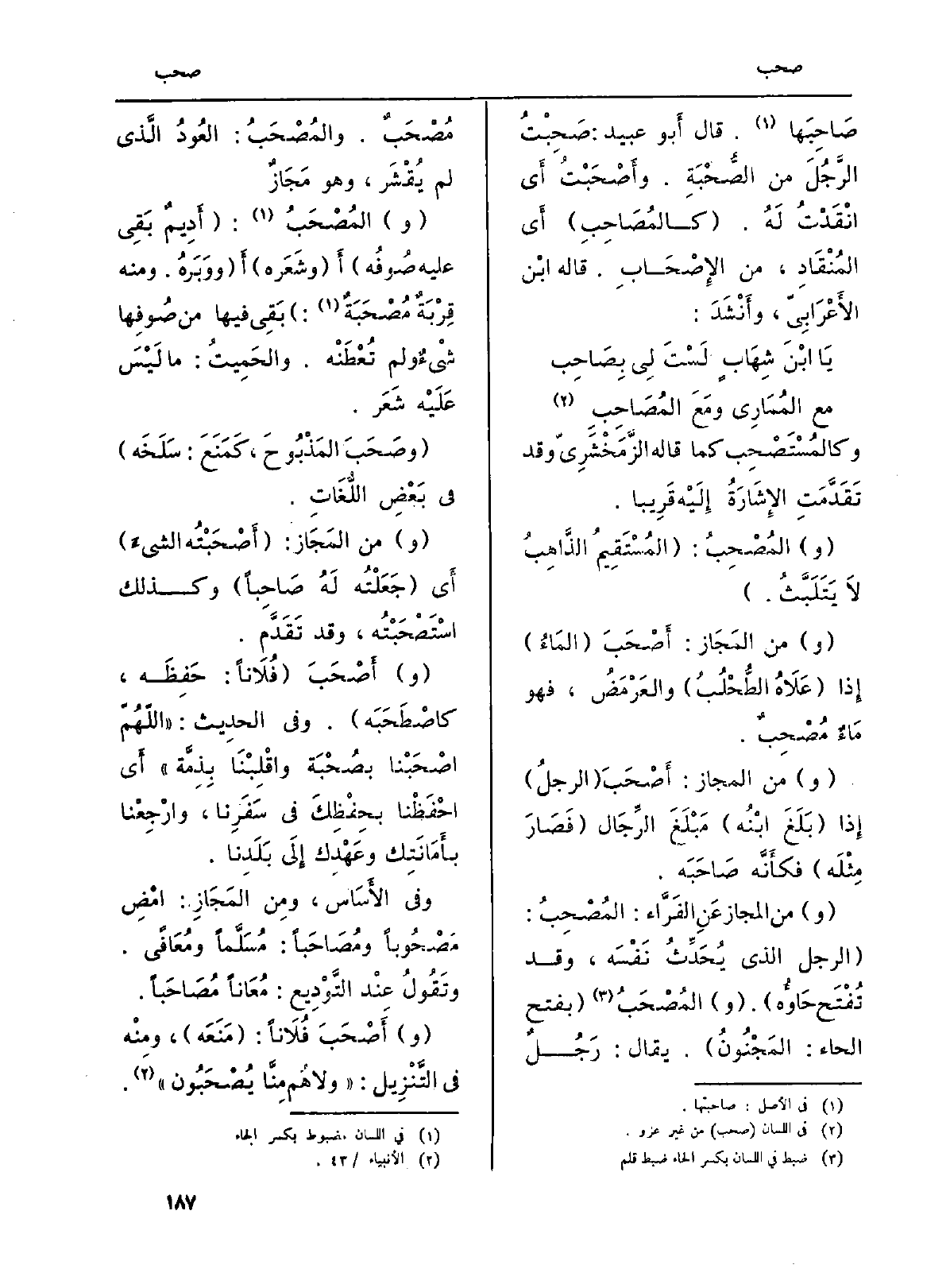 (و) من الْمجَاز عَنِ الفَرَّاء: المُصْحِبُ (الرجل الَّذِي يُحَدِّثُ نَفْسَه، وَقد تُفْتَح حَاؤُه) . (و) المُصْحَبُ (بِفَتْح الْحَاء: الَجْنُونُ) . يُقَال: رَجُلٌ مُصْحَبٌ. والمُصْحَبُ: العُودُ الَّذي لم يُقْشَر، وَهُوَ مجازٌ.