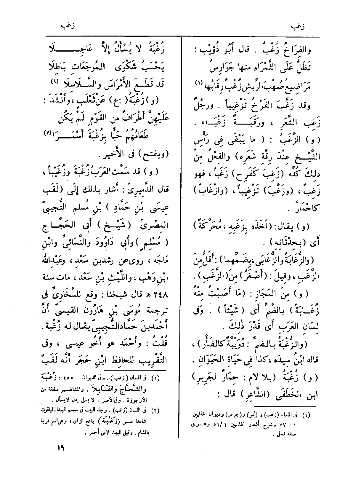 (و) قد سَمَّت العَرَبُ زُغْبَةَ وزُغَيْباً، قَالَ الدَّمِيرِيّ: أَشار بذلك إلَى (لَقَب عِيسَى بْنِ حَمَّادِ) بْنِ مُسلم التُّجيبيّ المِصْريّ (شَيْخ) أَبي الحَجَّاج (مُسْلِمٍ) وأَبي دَاوُودَ والنَّسَائِيِّ وابْنِ ماجَه، روى عَن رشد بن سَعْدِ، وعَبْدِ الله بْنِ وَهْب، واللَّيْثِ بْنِ سَعْد، مَاتَ سنة 248 هـ قَالَ شَيخنَا: وَقع للسَّخَاوِيِّ فِي تَرْجَمَة مُوسَى بْنِ هَارُون القيسيّ أَنَّ أحْمَد بنَ حَمَّاد التُّجِيبِيّ يُقَال لَهُ زُغْبة. قُلْتُ: وأَحْمَد هُوَ أَخُو عِيسَى، وَفِي التَّقْرِيب للحافِظ ابْنُ حَجَر أَنَّه لَقَبٌ