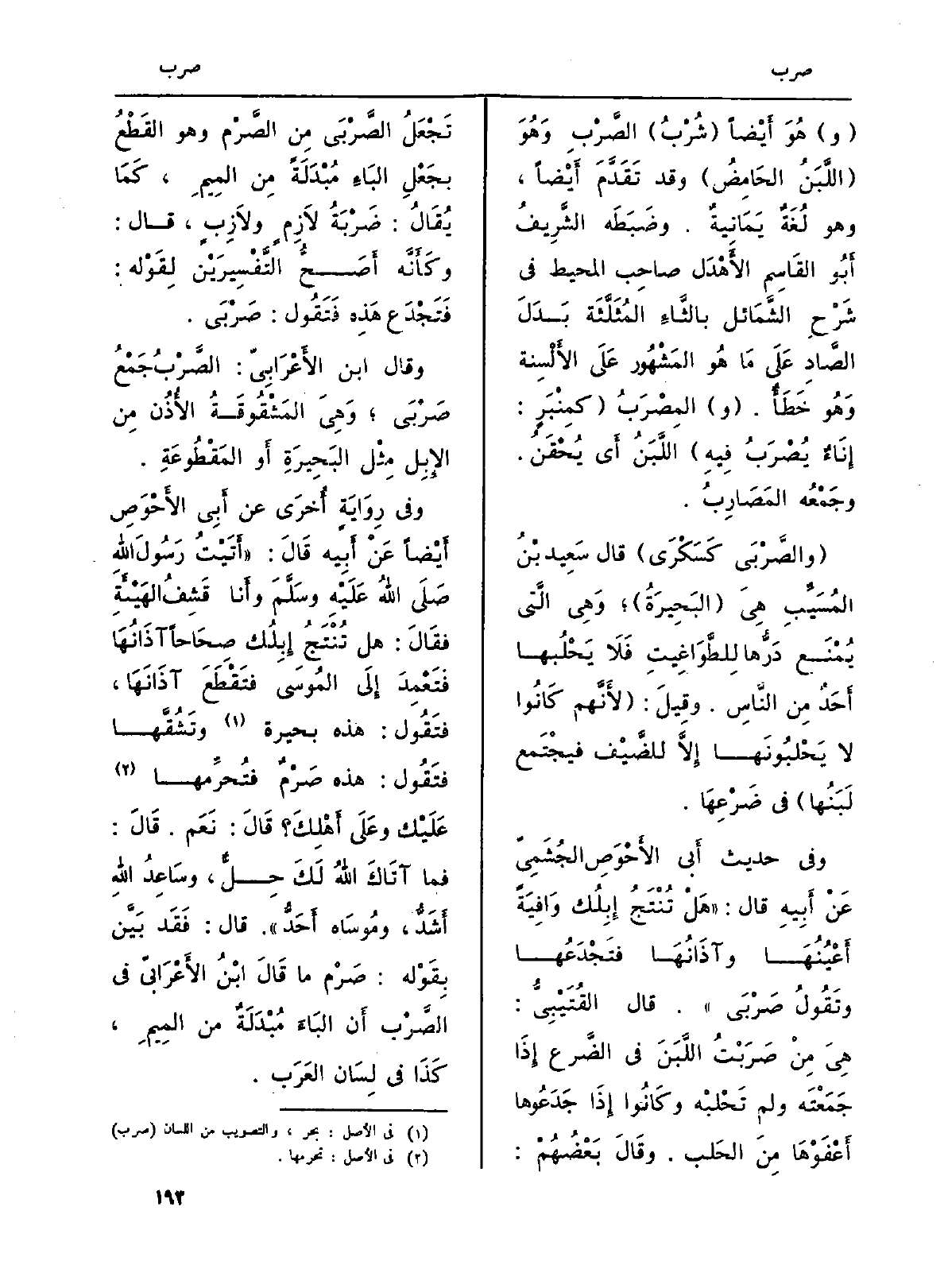 وَفِي حَدِيث أَبي الأَحْوَصِ الجُشَمِيّ عَنْ أَبِيهِ قَالَ: (هَلْ تُنْتَجُ إبِلُك وَافِيَةٌ أَعْيُنُهَا وآذَانُهَا فتَجْدَعُها وتَقُولُ صَرْبَى) . قَالَ القُتَيْبِيُّ: هِيَ مِنْ صَرَبْتُ اللَّبَنَ فِي الضَّرع إِذَا جَمَعْتَ وَلم تَحْلبْه وكَانُوا إِذَا جَدَعُوها أَعْفَوْهَا مِنَ الحَلب. وقَالَ بَعْضُهُمْ: تَجْعَلُ الصَّرْبَى مِن الصَّرْم وَهُوَ القَطْعُ بجَعْله البَاءِ مُبْدَلَةً مِن المِيمِ، كَمَا يُقَالُ: ضَرْبَةُ لَازِمٍ ولَازِبٍ، قَالَ: وكَأَنَّه أَصَحُّ التَّفْسِيرَيْنِ لِقَوْله: فَتَجْدَع هَذِه فَتَقُول صَرْبَى.