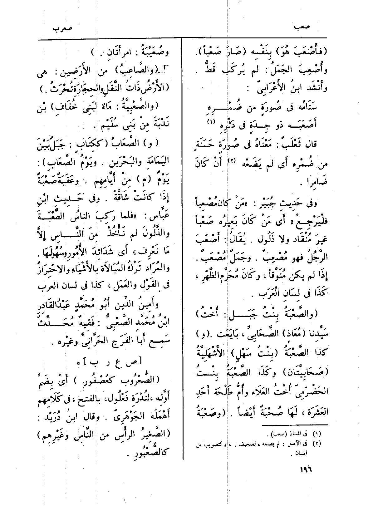 (و) الصِّعَابُ (ككِتَابٍ: جَبَلٌ بَيْنَ اليَمَامَةِ والبَحْرَين. ويَوْمُ الصَّعَابِ) : يَوْمٌ (م) مِنْ أَيَّامِهِم. وَعقَبَةٌ صَعْبَةٌ إِذَا كانَتْ شَاقَّةً. وَفِي حَدِيثِ ابْنِ عَبَّاس: (فَلَمَّا رَكِبَ الناسُ الصَّعْبَةَ والذَّلُولَ لم نَأْخُذْ مِنَ النَّاسِ إِلَّا مَا نَعْرِف) أَي شَدَائِدَ الأُمُرِ وسُهُولَهَا. والمُرَاد تَرْكُ المُبَالَاة بالأَشْيَاءِ والاحْتِرَازُ فِي القَوْل والعَمَل، كَذَا فِي لِسَان الْعَرَب.