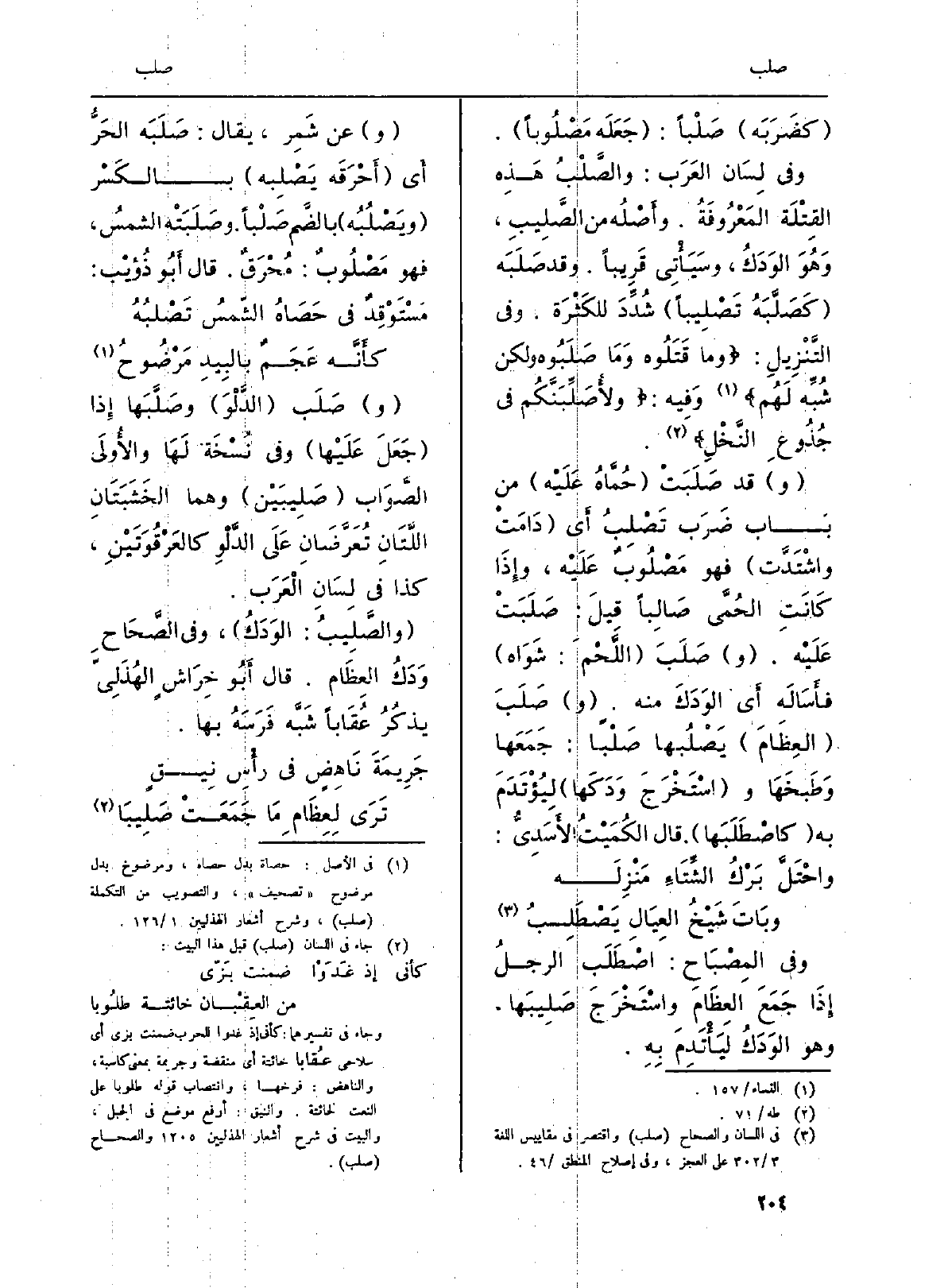 وَفِي لِسَان العَرَب: والصَّلْبُ هَذِه القِتْلَة المَعْرُفَةُ. وأَصْلُه من الصَّلِيبِ، وَهُوَ الوَدَكُ، وسَيَأْتِي قَرِيباً. وَقد صَلَبَه (كَصَلَّبَهُ تَصْلِيباً) شُدِّدَ للكَثْرَة. وَفِي التَّنْزِيلِ: {وَمَا قَتَلُوهُ وَمَا صَلَبُوهُ وَلَاكِن شُبّهَ لَهُمْ} (النِّسَاء: 157) وَفِيه: {فِى جُذُوعِ النَّخْلِ وَلَتَعْلَمُنَّ} (طه: 71) .