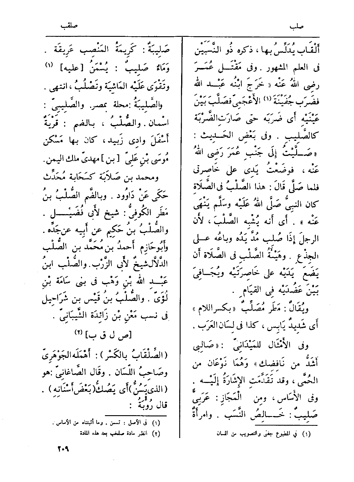 أَلْقَاب يُدَلِّسُ بهَا، ذكره ذُو النَّسَبَيْن فِي الْعلم الْمَشْهُور. وَفِي مَقْتَل عُمَرَ رضيِ اللهُ عَنْه (خَرَجَ ابْنُه عَبْد الله فضَرَب جُفَيْنَةَ الأَعْجَمِيّ فصَلَّبَ بَيْنَ عَيْنَيْهِ أَي ضَرَبَه حَتَّى صَارَتِ الضَّرّبَة كالصَّلِيبِ. وَفِي بَعْضِ الحَدِيث: (صَلَّيْتُ إِلَى جَنْبِ عُمَرَ رَضِي اللهُ عَنْه، فوضَعْتُ يَدي على خَاصِرتي فَلَمَّا صَلَّى قَلَ: هَذَا الصَّلْبُ فِي الصَّلَاةِ كَانَ النبِيُّ صَلَّى اللهُ عَلَيْه وسَلَّم يَنْهَى عَنْه. أَي أَنِ يُشْبِه الصَّلْبَ، لأَن الرجلَ إِذَا صُلِب مُدَّ يعدُه وباعُه على الجِذْعِ. وهَيْئَةُ الصَّلْبِ فِي الصَّلَاة أَن يَضَعَ يَدَيْه على خَاصرَتَيْه ويُجَافِيَ بَيْنَ عَضُدَيْه فِي القِيَامِ.