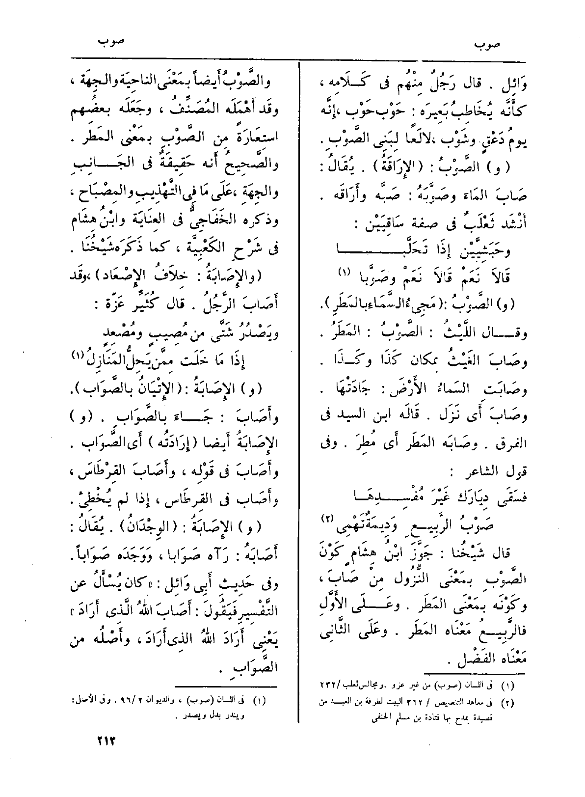 والصَّوْبُ أَيضاً بمَعْنَى الناحِيَة والجِهَة، وقَد أَهْمَلَه المُصَنِّفُ، وجَعَلَه بعضُهم استِعَارَةً مِن الصَّوْبِ بمَعْنى المَطَر. والصَّحِيحُ أَنه حَقِيقَةٌ فِي الجَانِبِ والجه 2 ةِ، عَلَى مَا فِي التَّهْذِيبِ والمِصْبَاح، وَذكره الخَفَاجِيُّ فِي العِنَايَة وابْنُ هِشَام فِي شَرْحِ الكَّعْبِيَّة، كَمَا ذَكَرَه شَيْخُنَا.