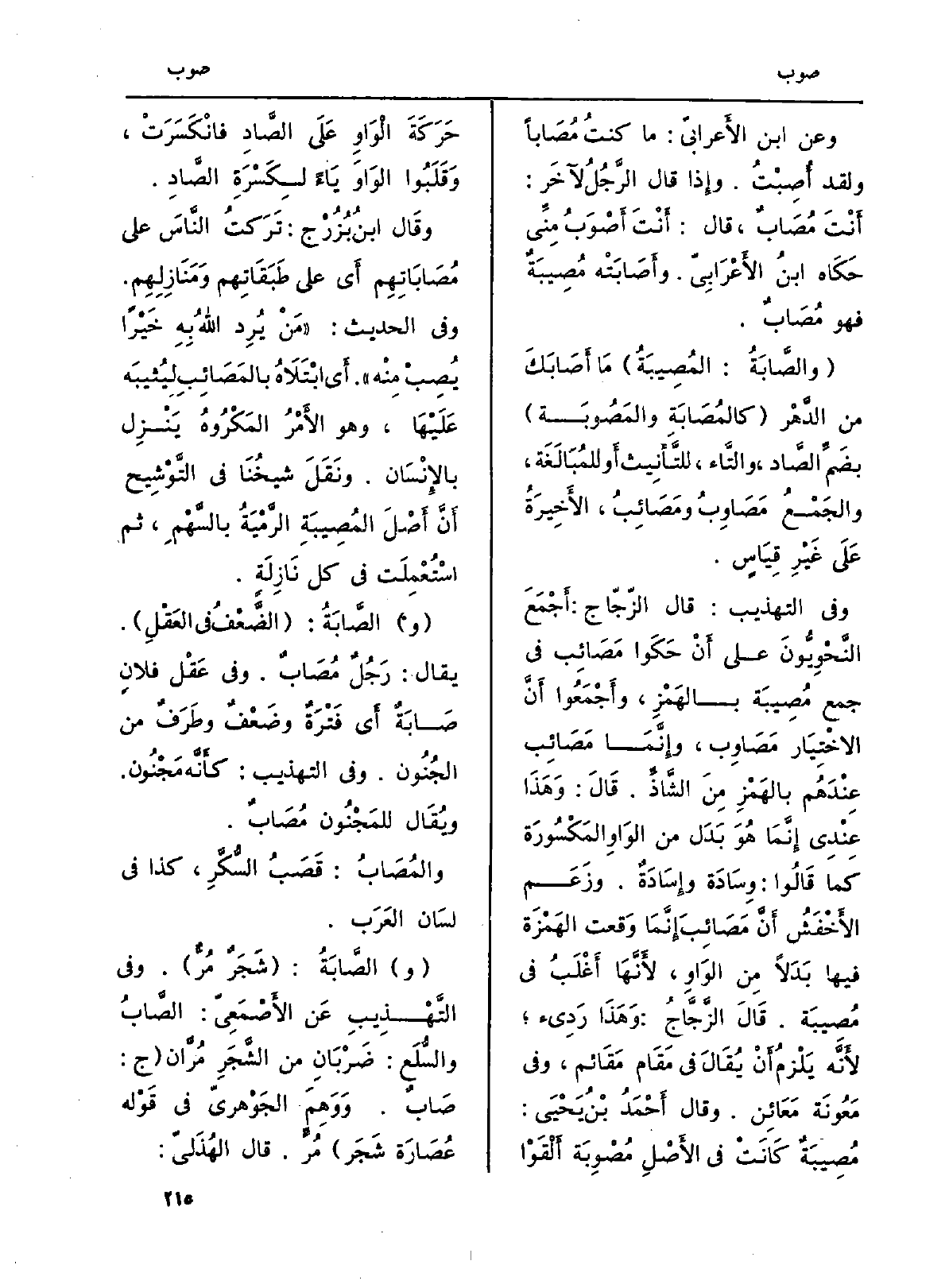وَعَن ابْن الأَعرابيّ: مَا كنتُ مُصَاباً وَلَقَد أُصِبْتُ: وإِذا قَالَ الرَّجُلُ لآخَر: أَنْتَ مُصَابٌ، قَالَ: أَنْتَ أَصْوَبُ مِنِّي حَكَاه ابنُ الأَعْرَابِيّ. وأَصَابَتْه مُصِيبَةٌ فَهُوَ مُصَابٌ.