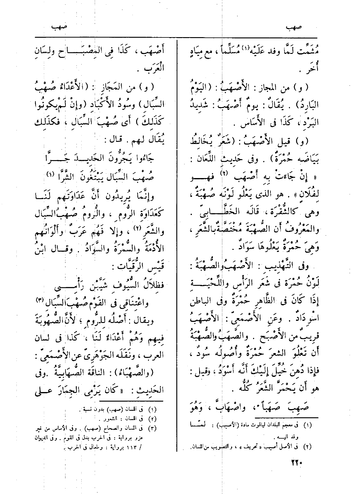 وَفِي التَّهْذِيبِ: الأَصْهَبُ والصُّهْبَةُ: لَوْنُ حُمْرَة فِي شَعَر الرَّأْسِ واللِّحْيَةِ إِذَا كَانَ فِي الظَّاهِرِ حُمْرَةٌ وَفِي الْبَاطِن. اسْوِدَادٌ. وعَنِ الأَصْمَعِيّ: الأَصْهَبُ قرِيبٌ من الأَصْبَح. والصَّهَبُ أَن تَعْلُوَ الشعرَ حُمْرَةٌ وأُصُولُه سُودٌ، فإِذا دُهِنَ خُيِّلَ إِلَيْكَ أَنَّه أَسْوَدُ، وَقل: هُوَ أَن يَحْمَرَّ الشَّعَرُ كُلُّه.