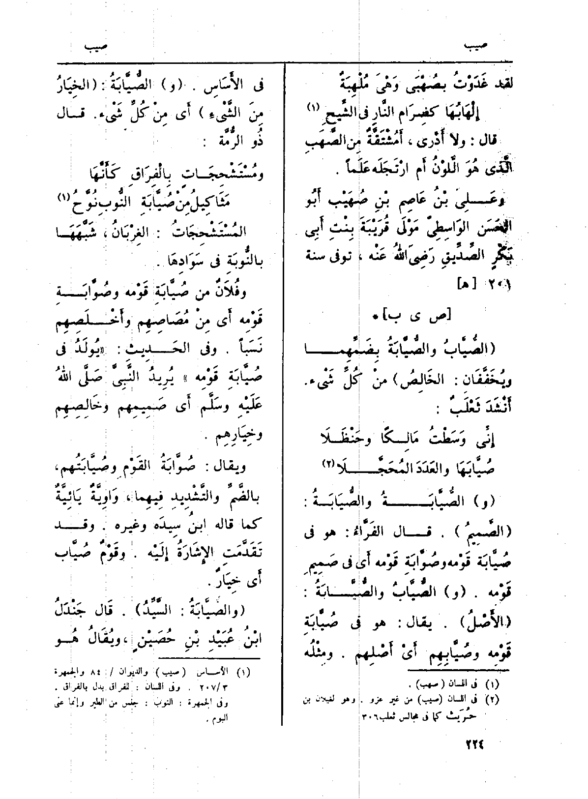 وفُلَانٌ من صُيَّابَةِ قَوْمه وصُوَّابَةِ قَوْمِه أَي مِنْ مُصَاصِهِم وأَخْلَصِهِم نَسَباً. وَفِي الحَدِيثِ: (يُولَدُ فِي صُيَّابَةِ قَوْمِه) يُرِيدُ النَّبِيَّ صَلَّى اللهُ عَلَيْهِ وسَلَّم أَي صَمِيمِهم وخَالِصِهِم وخِيَارِهِم.
