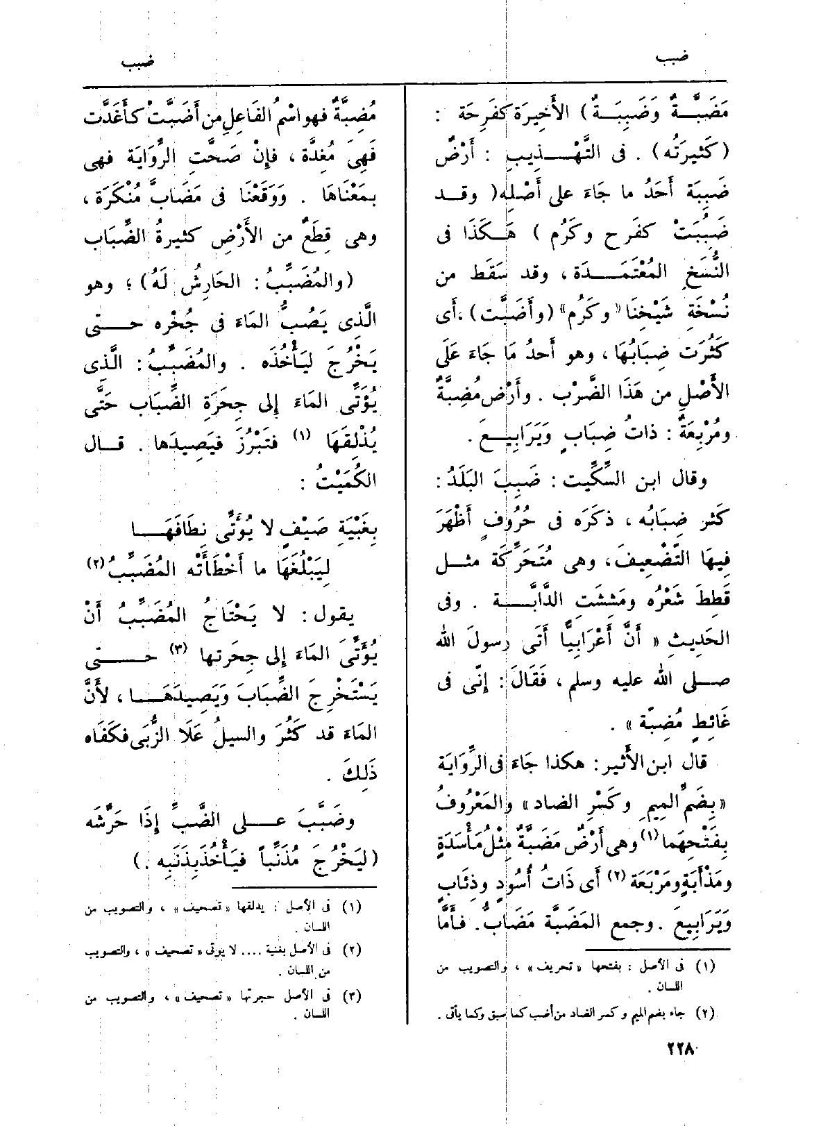 {مَضَبَّةٌ} وَضَبِيَةٌ) الأَخِيرَة كفَرِحَة: (كَثِيرَتُه) . فِي التَّهْذِيبِ: أَرْضٌ {ضَبِبة أَحَدُ مَا جَاءَ على أَصْلِه (وَقد} ضَبُبَتْ كفَرح وكَرُم) هَكَذَا فِي النُّسَخِ المُعْتَمَدَة، وَقد سَقَط من نُسْخَةِ شَيْخَنا (وكَرُم) ( {وأَضَبَّت) ، أَي كَثُرَت} ضِبَابُهَا، وَهُوَ أَحدُ مَا جَاءَ عَلَى الأَصْلِ من هَذَا الضَّرْب. وأَرْض {مُضِبَّةٌ ومُرْبِعَةٌ: ذاتُ} ضِبَابٍ وَيَرَابِيعَ.