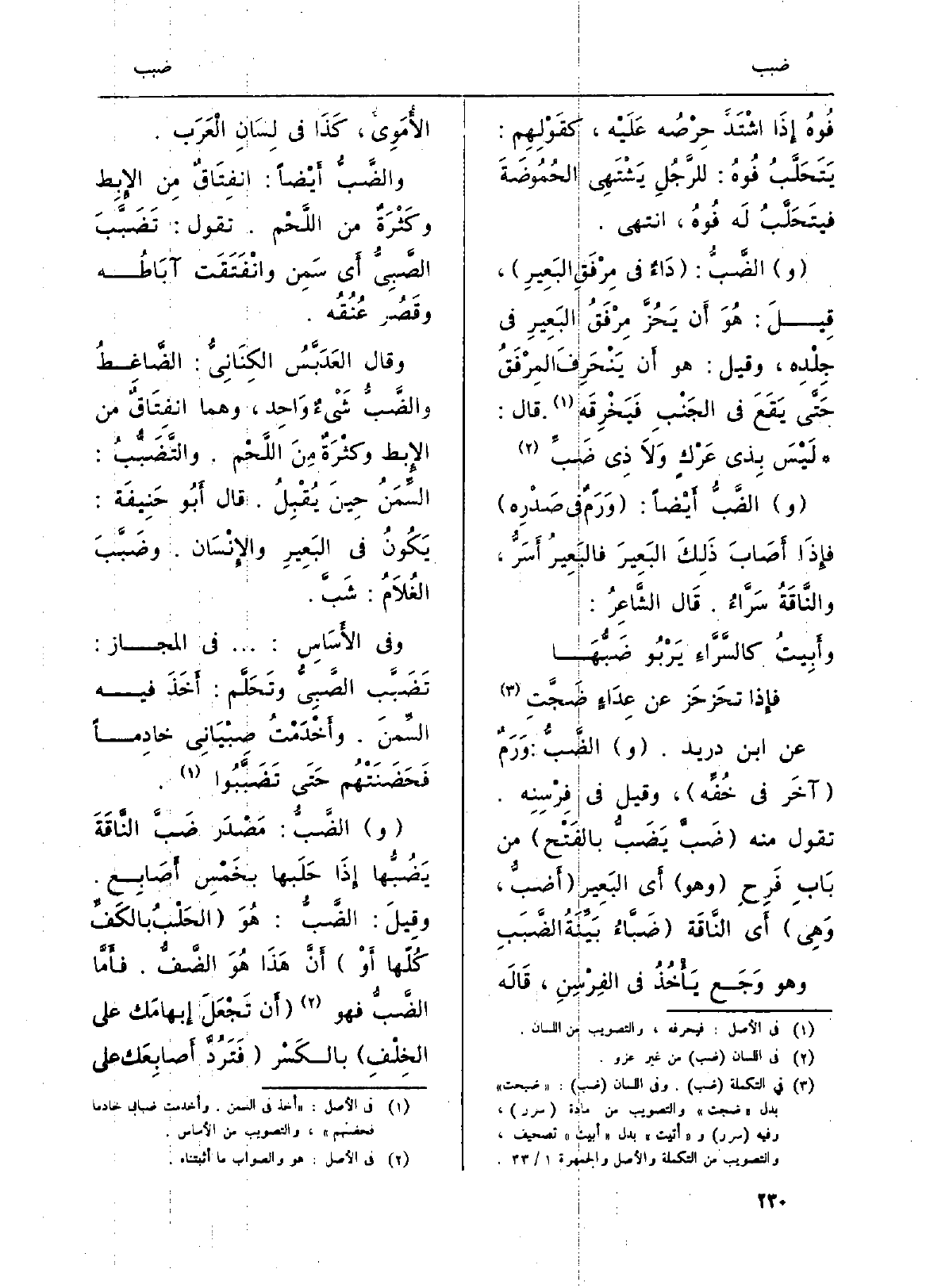 (و) الضَّبُّ: مَصْدَر ضَبَّ النَّاقَةَ يَضُبُّها إِذَا حَلَبها بخَمْسِ أَصَابِع. وقِيلَ: الضَّبُّ: هُوَ (الحَلْبُ بالكَفِّ كُلّها أَوْ) أَنَّ هَذَا هُوَ الضَّفُّ. فأَمَّا الضَّبُّ فَهُوَ (أَن تَجْعَلَ إِبهامَك على الخِلْفِ (بالكَسْر (فَتَرُد أَصابِعَك على