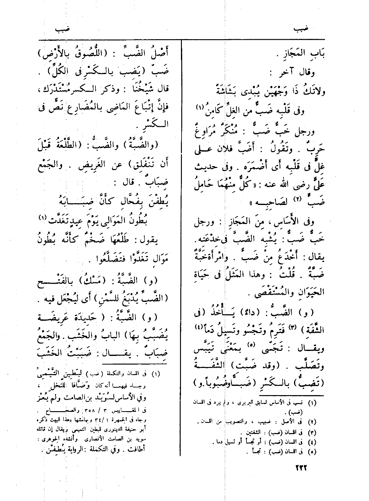 (و) الضَّبُّ: (داءٌ) يَأْخُذُ (فِي الشَّفَةِ) فَتَرِ وتَجْسُ وتَسِيلُ دَماً وَيُقَال: تَجَسًى بمَعْنَى تَيَبَّس وتَصَلَّب. (وَقد {ضَبَّتِ) الشَّفَةُ (} تَضِبُّ) بالكَسْرِ (ضَبًّا {وضُبُوباً. و) أَصْلُ الضَّبِّ: (اللُّصُوقُ بالأَرْضِ) ضَبّ (يَضِب بالكَسْرِ فِي الكُلِّ) . قَالَ شَيْخُنَا: وَذكر الْكسر مُسْتَدْرَك، فإِنَّ إِتْبَاعَ المَاضِي بالمُضَارِع نَصٌّ فِي الكَسْرِ.