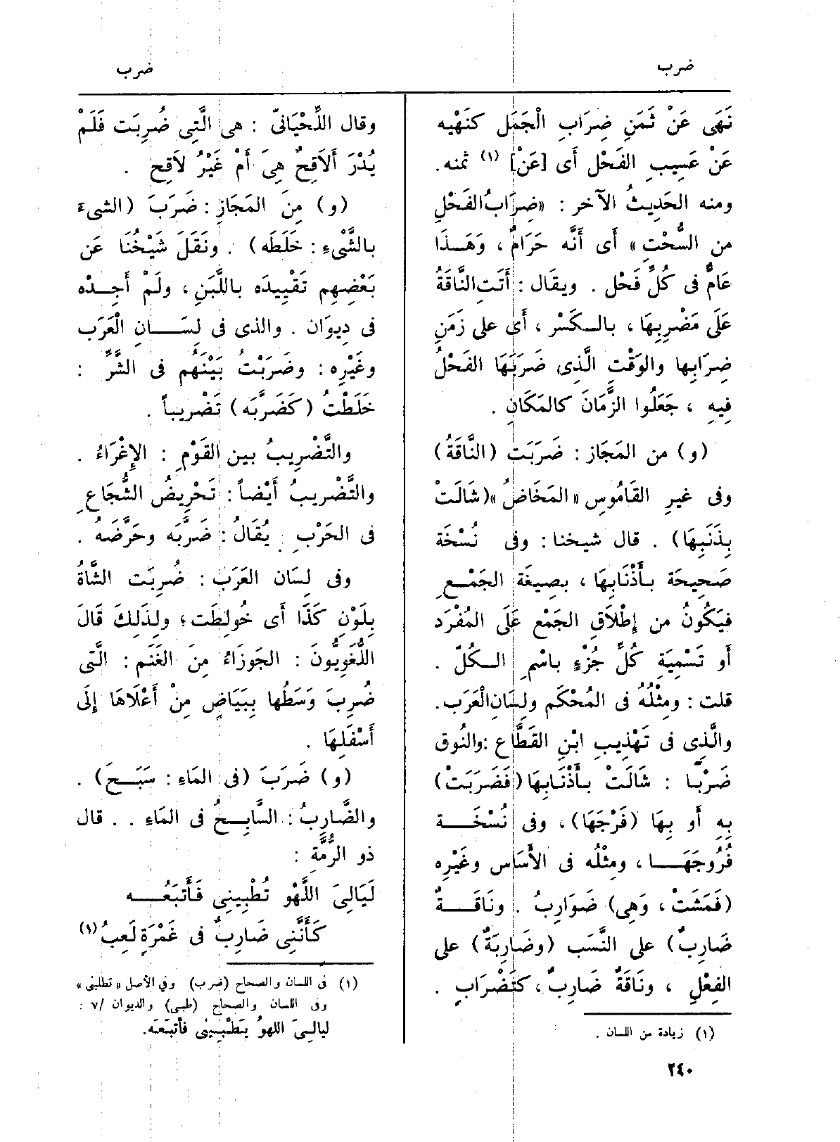 نَهَى عَنْ ثَمَنِ ضِرَابِ الْجَمَل كنَهْيه عَنْ عَسِيبِ الفَحْل أَي (عَنْ) ثمنه. وَمِنْه الحَدِيثُ الآخر: (ضِرَابُ الفَحْلِ من السُّحْتِ) أَي أَنَّه حَرَامٌ، وَهَذَا عامٌّ فِي كُلِّ فَحْل. ويقَال أَتَتِ النَّاقَ عَلَى مَضْرِبِهَا، بالكَسْر، أَي على زَمَنِ ضِرَابِها والوَقْتِ الَّذِي ضَرَبَهَا الفَحْلُ فِيهِ، جَعَلُوا الزَّمَانَ كالمَكَانِ.