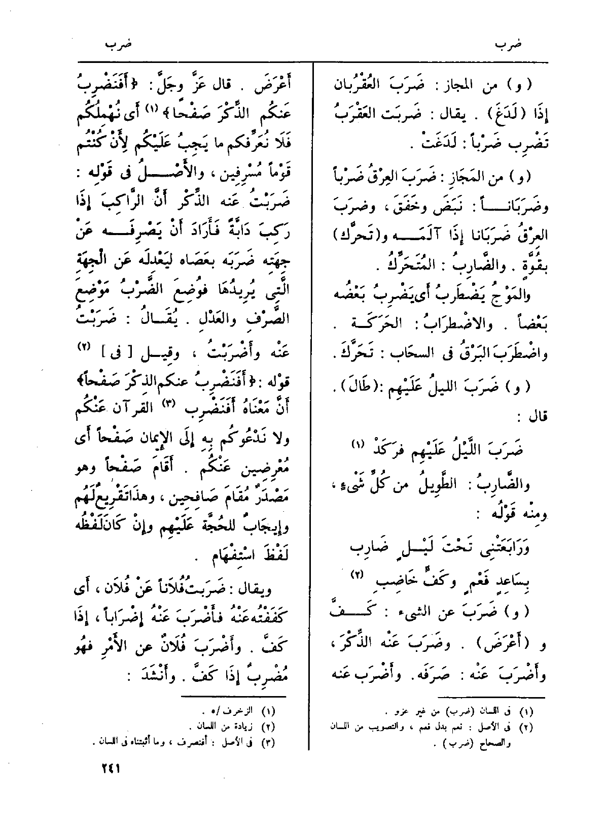 (و) ضَرَبَ عَن الشَّيْء: كَفَّ و (أَعْرَضَ) . وضَرَبَ عَنْه الذِّكْرَ، وأَضْرَبَ عَنْه: صَرَفَه. وأَضْرَب عَنه أَعْرَضَ. قَالَ عَزَّ وجَلَّ: {أَفَنَضْرِبُ عَنكُمُ الذّكْرَ صَفْحاً} (الزخرف: 5) أَي نُهْمِلُكُم فَلَا نُعَرِّفكم مَا يَجِبُ عَلَيْكُم لِأَنْ كُنْتُم قَوْماً مُسْرِفِين، الأَصْلُ فِي قَوْلِه: ضَرَبْتُ عَنه الذِّكْر أَنَّ الرَّاكِبَ إِذَا رَكِبَ دَابَّةً فَأَرَادَ أَنْ يَصْرِفَه عَنْ جِهَتِهِ ضَرَبَه بعَصَاه ليَعْدِلَه عَن الْجِهَةِ الَّتِي يُرِيدُهَا فوُضِعَ الضَّرْبُ مَوْضِعَ الصَّرْفِ والعَدْلِ. يُقَالُ: ضَرَبْتُ عَنْه وأَضْرَبْتُ، وقِيل (فِي) قوْله: {أَفَنَضْرِبُ عَنكُمُ الذّكْرَ صَفْحاً} أَنَّ مَعْنَاهُ أَفَنَضْرِب الْقُرْآن عَنْكُم وَلَا نَدْعُوكُم بِهِ إِلَى الإِيمان صَفْحاً أَي مُعْرِضِين عَنْكُم. أَقَامَ صَفْحاً وَهُوَ مَصْدَرٌ مُقَامَ صَافِحِين، وهذَا تَقْرِيعٌ لَهُم وإِيجَابٌ للحُجَّة عَلَيْهِ وإِنْ كَانَ لَفْظُه لَفْظَ اسْتِفْهَام.