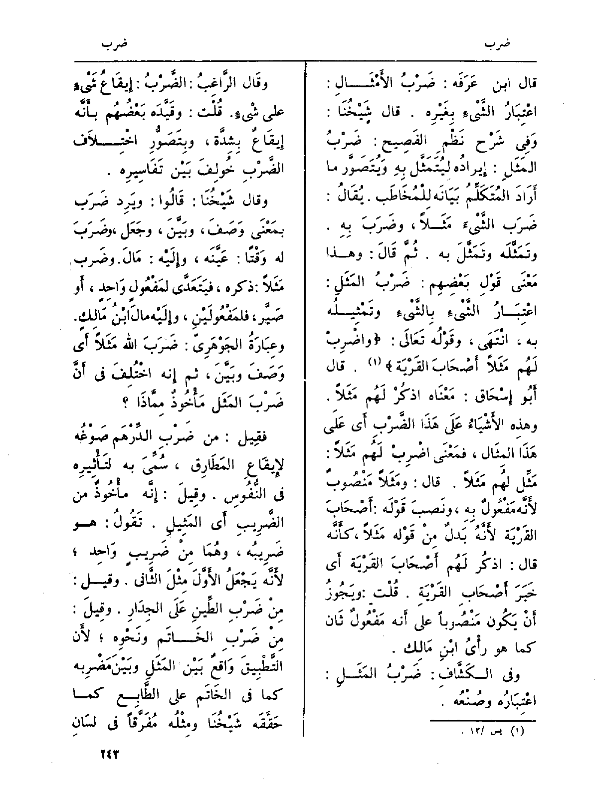 قَالَ ابْن عَرَفَه: ضَرْبُ الأَمْثَالِ: اعْتِبَارُ الشَّيْءِ بِغَيْرِه. قَالَ شَيْخُنَا: وَفِي شَرْح نَظْمِ الفَصِيح: ضَرْبُ المَثلِ: إِيرادُه لِيُتَمَثَّل بِهِ وَيُتَصَوَّر مَا أَرَادَ المُتَكَلِّمُ بَيَانَه لِلْمُخَاطَب. يُقَالُ: ضَرَب الشَّيْءَ مَثَلاً، وضَرَبَ بِهِ. وتَمَثَّلَه وتَمَثَّلَ بِهِ. ثُمَّ قَالَ: وَهَذَا مَعْنى قَوْلِ بَعْضِهِم: ضَرْبُ المَثَلِ: اعْتِبَارُ الشَّيْءِ بِالشَّيْءِ وتَمْثِيلُه بِهِ، انْتَهَى، وقَوْلُه تَعَالَى: {وَاضْرِبْ لَهُمْ مَّثَلاً أَصْحَابَ القَرْيَةِ} (يللهس: 13) . قَالَ أَبُو إِسْحَاق: مَعْنَاه اذكُرْ لَهُم مَثَلاً: مَثِّل لهُم مَثَلاً. قَالَ: ومَثَلاً مَنْصُوبٌ لأَنَّه مَفْعُولٌ بِهِ، ونَصبَ قَوْلَه: أَصْحَابَ القَرْيَة لأَنَّهُ بَدلٌ مِنْ قَوْله مَثَلاً، كأَنَّه قَالَ: اذكُر لَهُم أَصْحَابَ القَرْيَة أَي خَبَرَ أصْحَابِ القَرْيَةِ. قُلْت: ويَجُوزُ أَنْ يَكُون مَنْصُوباً على أَنه مَفْعُولٌ ثَانِ كَمَا هُوَ رأْيُ ابْنِ مَالِك.