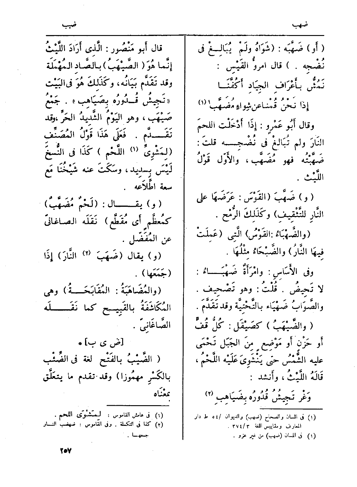 وَقَالَ أَبُو عَمْرٍ و: إِذَا أَدْخَلْت اللحمَ الدَارَ وَلم نُبَالغْ فِي نُضْجِه قلتَ: ضَهَّبْتُه فه ومُضَهَّب، والأَوّل قَوْلُ اللَّيْث.