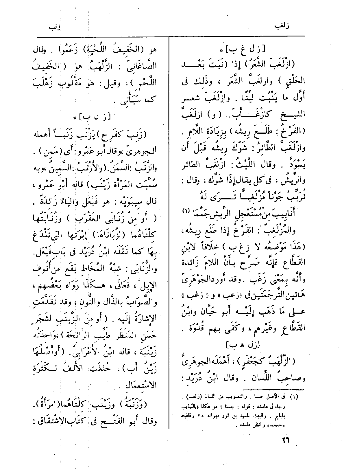 : (ازْلَغَبْ الشَّعَرُ) إِذا (نَبَتَ بَعْد الحَلْقِ) وازلغَبَّ الشَّعَر، وذَلِك فِي أَوَّل مَا ينْبُت ليِّناً. وازْلَغَبّ شعر الشَّيْخ كازْغَأَبّ. (و) ازلَغَبَّ (الفَرْخُ: طَلَعَ رِيشُه) بِزِيَادَةِ اللَّامِ. وازْلَغَبَّ الطَّائِرُ: شَوّكَ، وَقَالَ:
