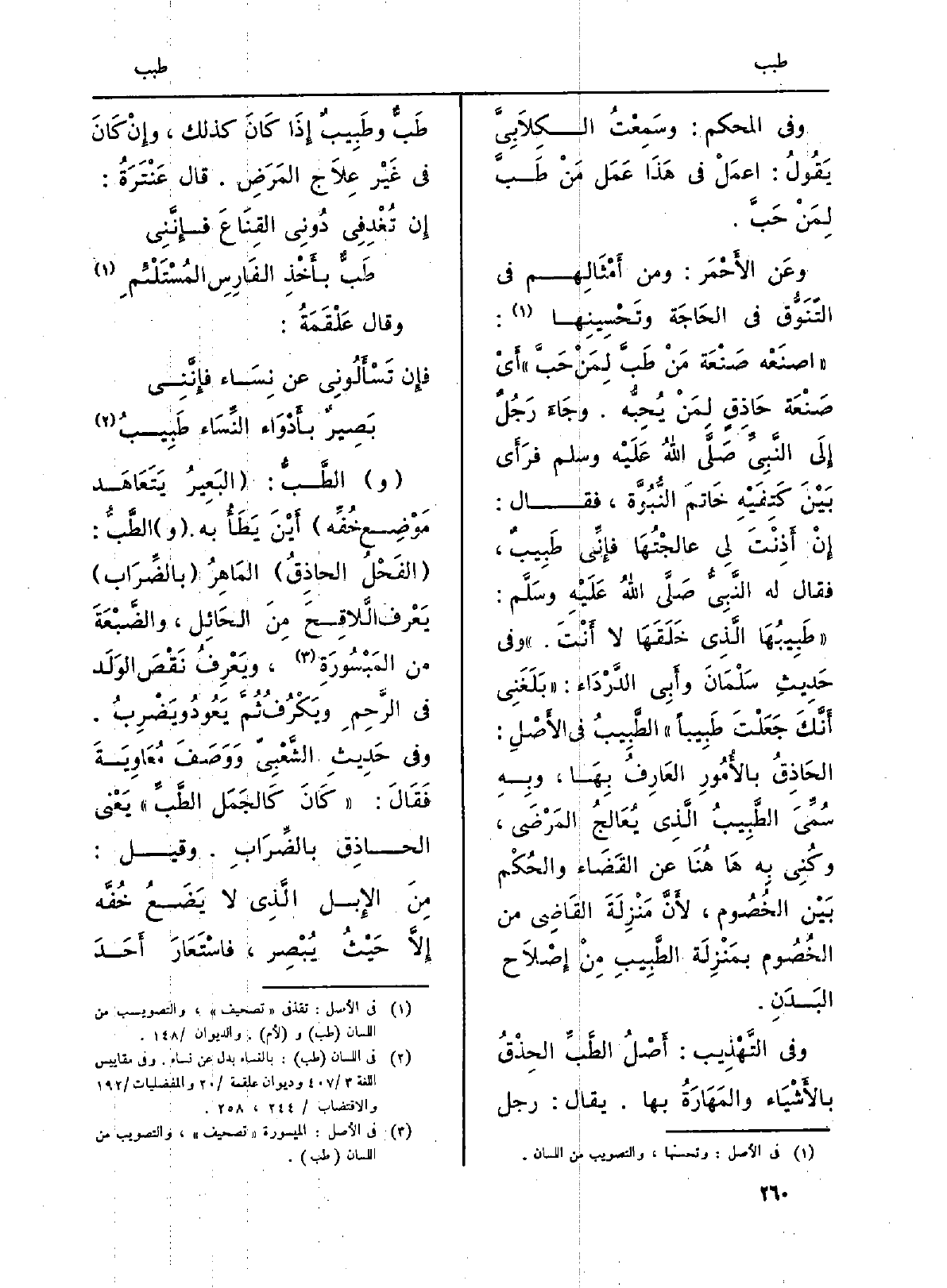 وعَن الأَحْمَر: وَمن أَمْثَالِهم فِي التُّنَوُّق فِي الحَاجَة وتَحْسِينِها: (اصنَعْه صَنْعَة مَنْ طَبَّ لِمَنْ حَبَّ) أَيْ صَنْعَة حَاذِقٍ لِمَنْ يُحِبه. وجَاءَ رَجُلٌ إِلَى النَّبِيِّ صَلَّى اللهُ عَلَيْه وَسلم فرَأَى بَيْنَ كَتِفَيْهِ خَاتمَ النُّبُوَّة، فَقَالَ: إِنْ أَذِنْتَ لِي عالجْتُهَا فإِنِّي طَبِيبٌ، فَقَالَ لَهُ النَّبِيُّ صَلَّى اللهُ عَلَيْهِ وسَلَّم: (} طَبِيبُهَا الَّذِي خَلَقَهَا لَا أَنْتَ) . وَفِي حَدِيثِ سَلْمَانَ وأَبِي الدَّرْدَاء: (بَلَغَنِي أَنَّكَ جَعَلْتَ طَبِيباً) الطَّبِيبُ فِي الأَصْلِ: انحَاذِقُ بالأُمُورِ العَارِفُ بِهَا، وبِهِ سُمِّيَ الطَّبِيبُ الَّذِي يُعَالجُ الَرْضَى، وكُنِي بِه هَا هُنَا عَن القَضَاءِ والحُكْم بَيْن الخُصُوم، لأَنَّ مَنْزِلَةَ القَاضِي من الخُصُوم بمَنْزِلَة الطَّبِيبِ مِنْ إِصْلَاح البَدَنِ.