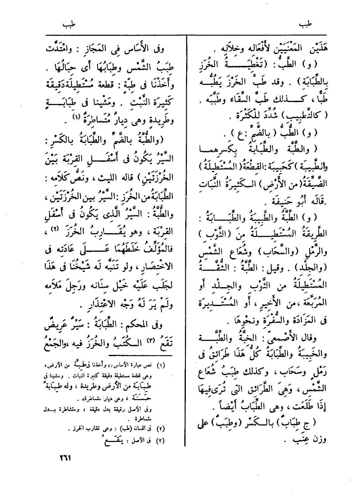 (} والطِّبَّة {والطِّبَابَةُ بِكَسرِهما} والطَّبِيبَة) كَحَبِيبَة: القِطْعَةُ (المُسْتَطِيلَةُ) الضَّيِّقَةُ (من الأَرْضِ) الكَثِيرَةُ النَّبَاتِ قَالَه أَبُو حَنِيفَة.