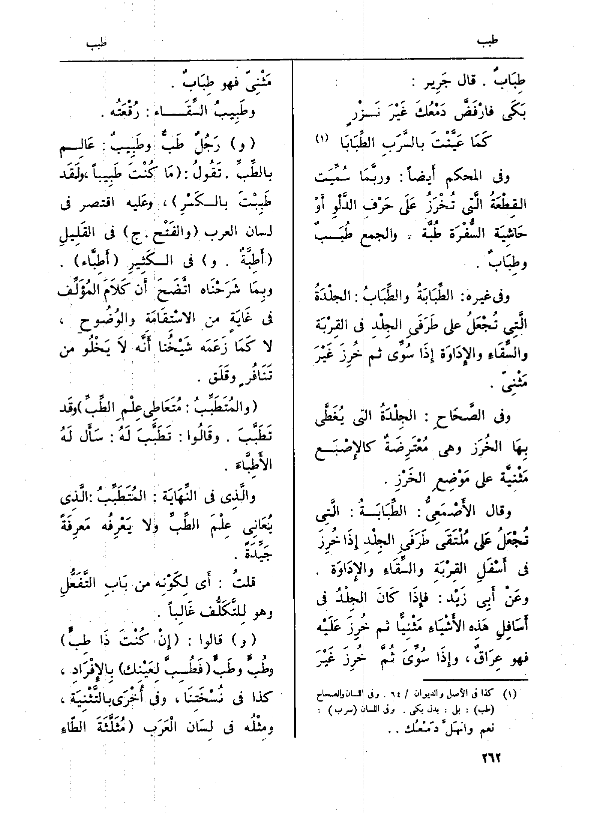 وَفِي غير: الطِّبَابَةُ والطِّبَابُ: الجلْدَةُ الَّتِي تُجْعَلُ على طَرَفَي الجِلْدِ فِي القِرْبَة والسِّقَاءِ والإِدَاوَة إِذَا سُوِّي ثمَّ خُرِزَ غَيْرَ مَثْنِيً.