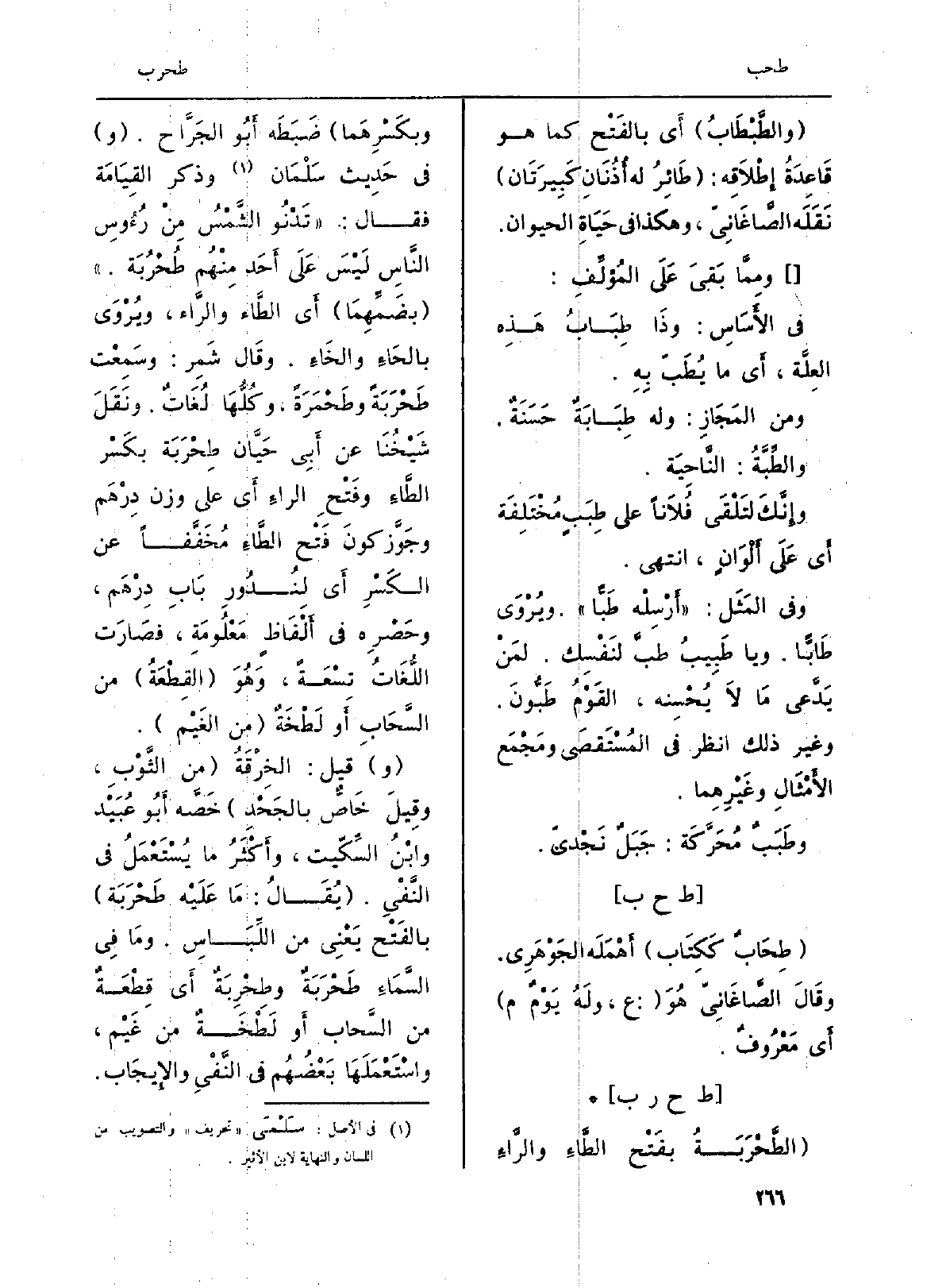 (و) قيل: الخِرْقَةُ (من الثَّوْبِ، وقِيلَ خَاصٌّ بالجَحْدِ) خَصَّه أَبُو عُبَيْد وابْنُ السِّكّيت، وأَكْثَرُ مَا يُسْتَعْمَلُ فِي النَّفْي. (يُقَالُ: مَا عَلَيْه طَحْرَبَة) بالفَتْح يَعْنِي من اللِّبَاسِ. ومَا فِي السَّمَاءِ طَحْرَبَةٌ وطِحْرِبَةٌ أَي قِطْعَةٌ من السَّحاب أَو لَطْخَةٌ من غَيْم، واسْتَعْمَلَهَا بَعْضُهُم فِي النَّفْيِ والإِيجَاب.