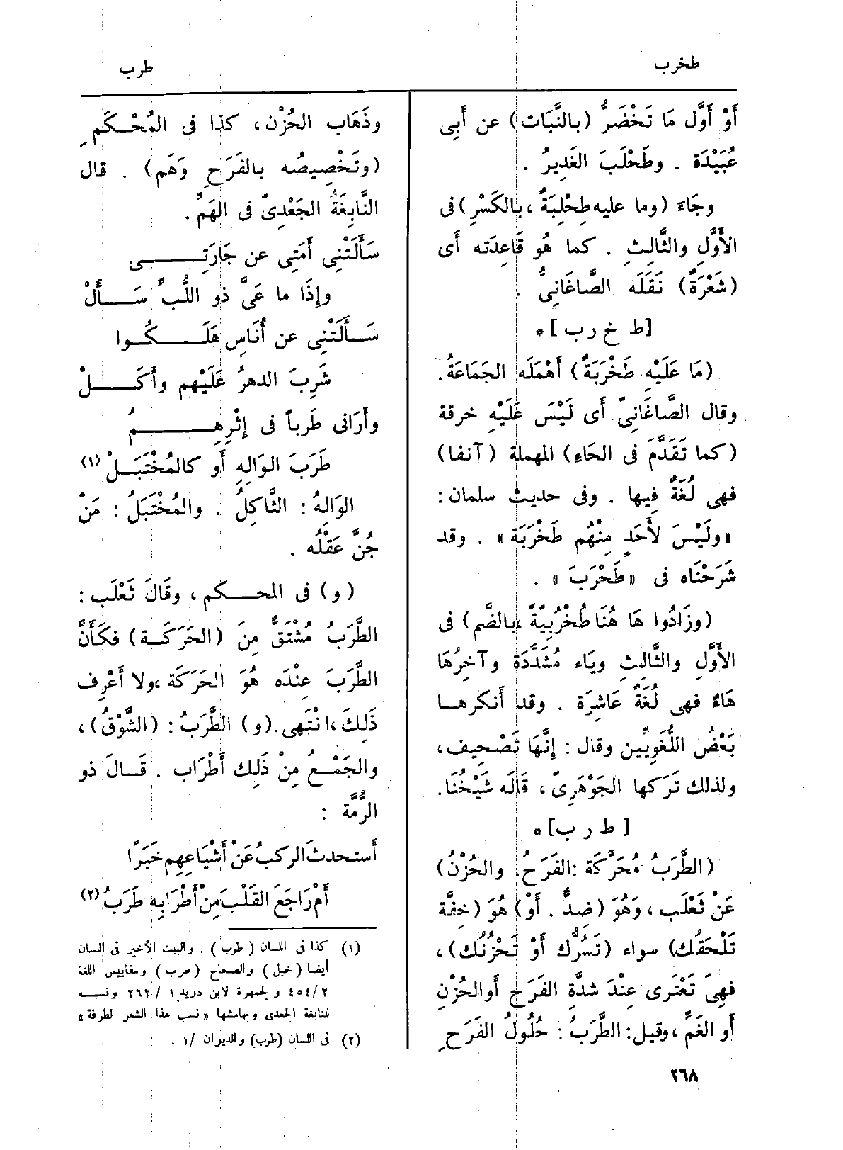 : (الطَّرَبُ مُحَرَّكَة: الفَرَحُ. والحُزْنُ) عَنْ ثَعْلَب، وَهُوَ (ضِدٌّ. أَوْ) هُوَ (خِفَّة تَلْحَقُك) سَوَاء (تَسُرُّك أوْ تَحْزُنُك) ، فهِيَ تَعْتَرى عِنْدَ شدَّةِ الفَرَح أَو الحُزْنِ أَو الغَمِّ، وَقيل: الطَّرَبُ: حُلُولُ الفَرَحِ وذَهَاب الحُزْن، كَذَا فِي المُحْكَمِ (وتَخْصِيصُه بالفَرَحِ وَهَم) . قَالَ النَّابِغَةُ الجَعْدِيّ فِي الهَمِّ: