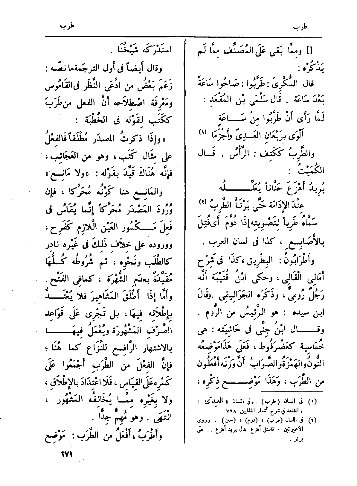 وَقَالَ أَيضاً فِي أَول الترجَمة مَا نصّه: زَعَمَ بَعْضُ من ادَّعَى النَّظَر فِي القَامُوس ومَعْرِفَة اصْطِلَاحه أَنَّ الْفِعْل من طَرَبَ ككَتَب لِقَوْله فِي الخُطْبَة.