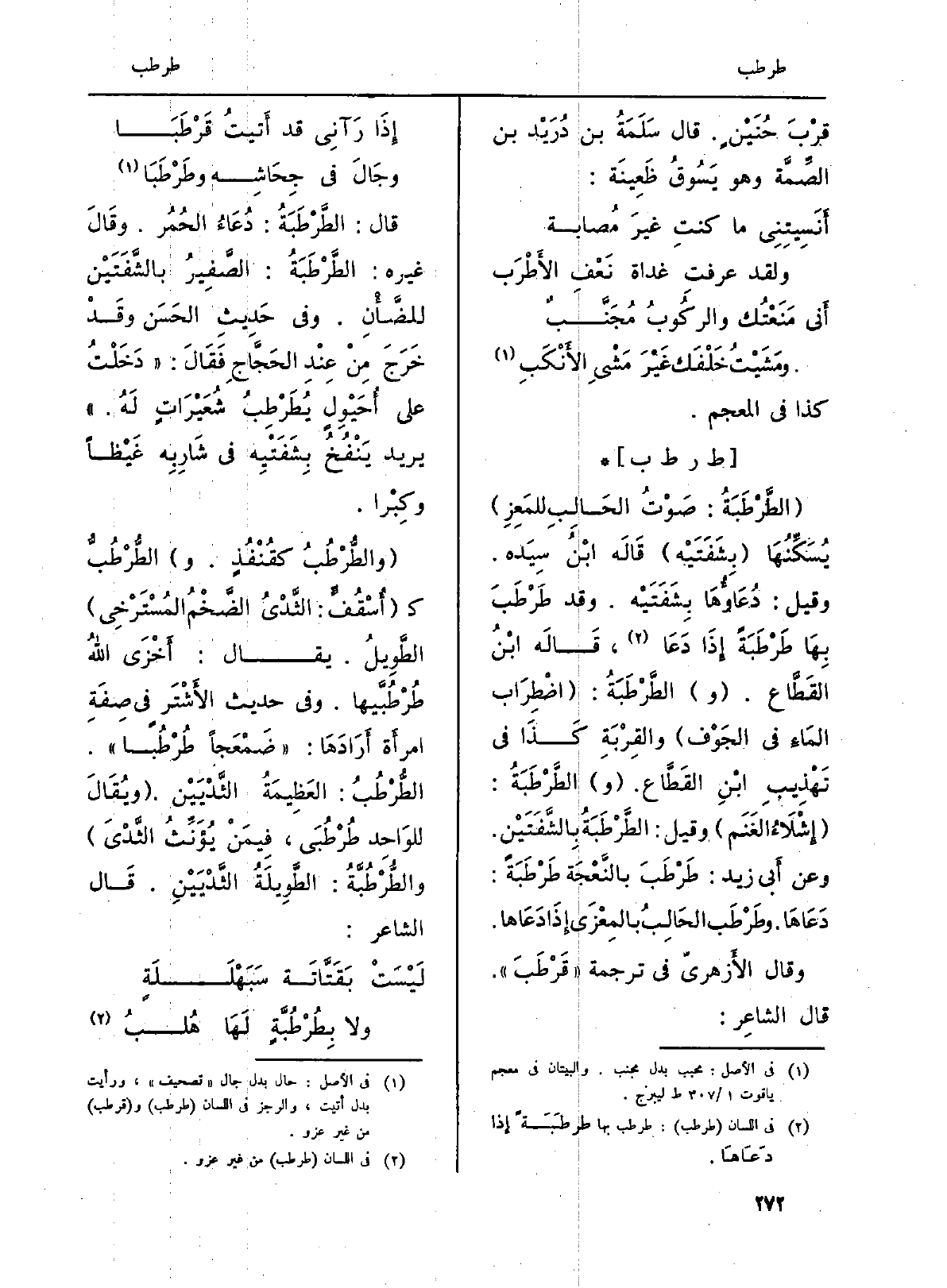 قَالَ: الطَّرْطَبَةُ: دُعَاءُ الحُمُر. وقَالَ غَيره: الطَّرْطَبَةُ: الصَّفِيرُ بالشَّفَتَيْن للضَّأْنِ. وَفِي حَدِيثِ الحَسَن وقَدْ خَرَجَ مِنْ عِنْدِ الحَجَّاجِ فَقَالَ: (دَخَلْتُ على أُحَيْوِلَ يُطَرْطِبُ شُعَيْرَاتٍ لَهُ) يُرِيد يَنْفُخُ بِشَفَتْيِه فِي شَارِبِه غَيْظاً وكِبْرا.