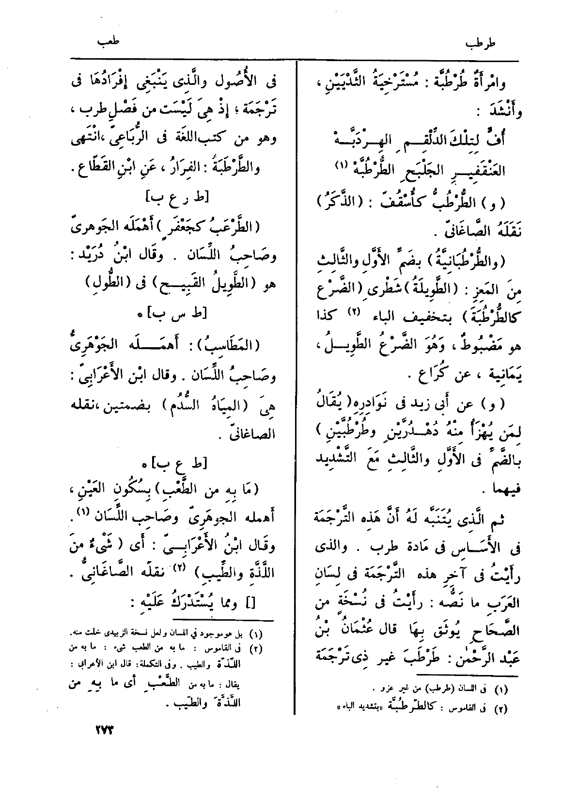 ثمَّ الَّذِي يُتَنَبَّه لَهُ أَنَّ هَذِه التَّرْجَمَة فِي الأَسَاسِ فِي مَادة طرب. وَالَّذِي رأَيْتُ فِي آخِرِ هَذِه التَّرْجَمَة فِي لِسَانِ العَرَبِ مَا نَصُّه: رأَيْتُ فِي نُسْخَةٍ من الصَّحَاحِ يُوثَق بِهَا قَالَ عُثْمَانُ بْنُ عَبْد الرَّحْمن: طَرْطَبَ غير ذِي ترْجَمَة فِي الأُصُول والَّذِي يَنْبَغِي إِفْرَادُهَا فِي ترْجَمَة؛ إِذْ هِيَ لَيْسَت من فَصْلِ طرب، وَهُوَ من كتب اللغَة فِي الرُّبَاعِيّ، انْتَهى.