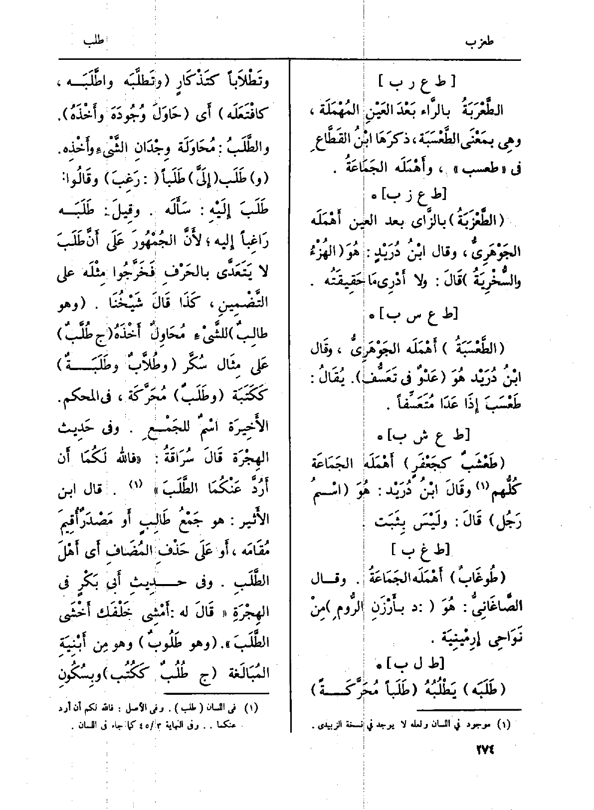 : (طَلَبَه) يَطْلُبُهُ (طَلَباً مُحَرَّكَةً وتَطْلَاباً كتَذْكَارٍ (وتَطلَّبَه واطَّلَبَه، كافْتَعَله) أَي (حَاوَلَ وُجُودَهَ وأَخْذَهُ) . والطَّلَبُ: مُحَاوَلَة وِجْدَانِ الشَّيْء وأَخْذِه. (و) طَلَب (إِلَيَّ) طَلَباً: (رَغِبَ) وقَالُوا: طَلَبَ إِلَيْهِ: سَأَلَه. وقِيلَ: طَلَبَه رَاغِباً إِليه؛ لأَنَّ الجُمْهُورَ عَلَى أَنَّ طَلَبَ لَا يَتَعَدَّى بالحَرْفِ فخَرَّجُوا مِثْلَه على التَّضْمِينِ، كَذَا قَالَ شَيْخُنَا. (وَهُوَ طالِبٌ) للشَّيْءِ مُحَاوِلٌ أَخْذَهُ (ج طُلَّبٌ) عَلى مِثَال سُكَّر (وطُلَّابٌ وطَلَبَةٌ) كَكَتَبَة (وطَلَبٌ) مُحَرَّكَة، فِي الْمُحكم. الأَخِيرَة اسْمٌ للجَمْعِ. وَفِي حَدِيث الهِجْرَة قَالَ سُرَاقَةُ: (فَالله لَكُمَا أَن أَرُدَّ عَنْكُمَا الطَّلَبَ) . قَالَ ابنِ الأَثير: هُوَ جَمْعُ طَالِبٍ أَو مَصْدَرٌ أُقِيمِ مُقَامَه، أَو عَلَى حَذْفِ المُضَافِ أَي أَهْلَ الطَّلَبِ. وَفِي حدِيثِ أَبي بَكْرٍ فِي الهِجْرَةِ (قَالَ لَهُ: أَمْشِي خَلْفَك أَخْشَى الطَّلَبَ) . (وَهُوَ طَلُوبٌ) وَهُوَ مِن أَبْنيَةِ المُبَالَغة (ج طُلُبٌ كَكُتُب) وبِسُكُونِ