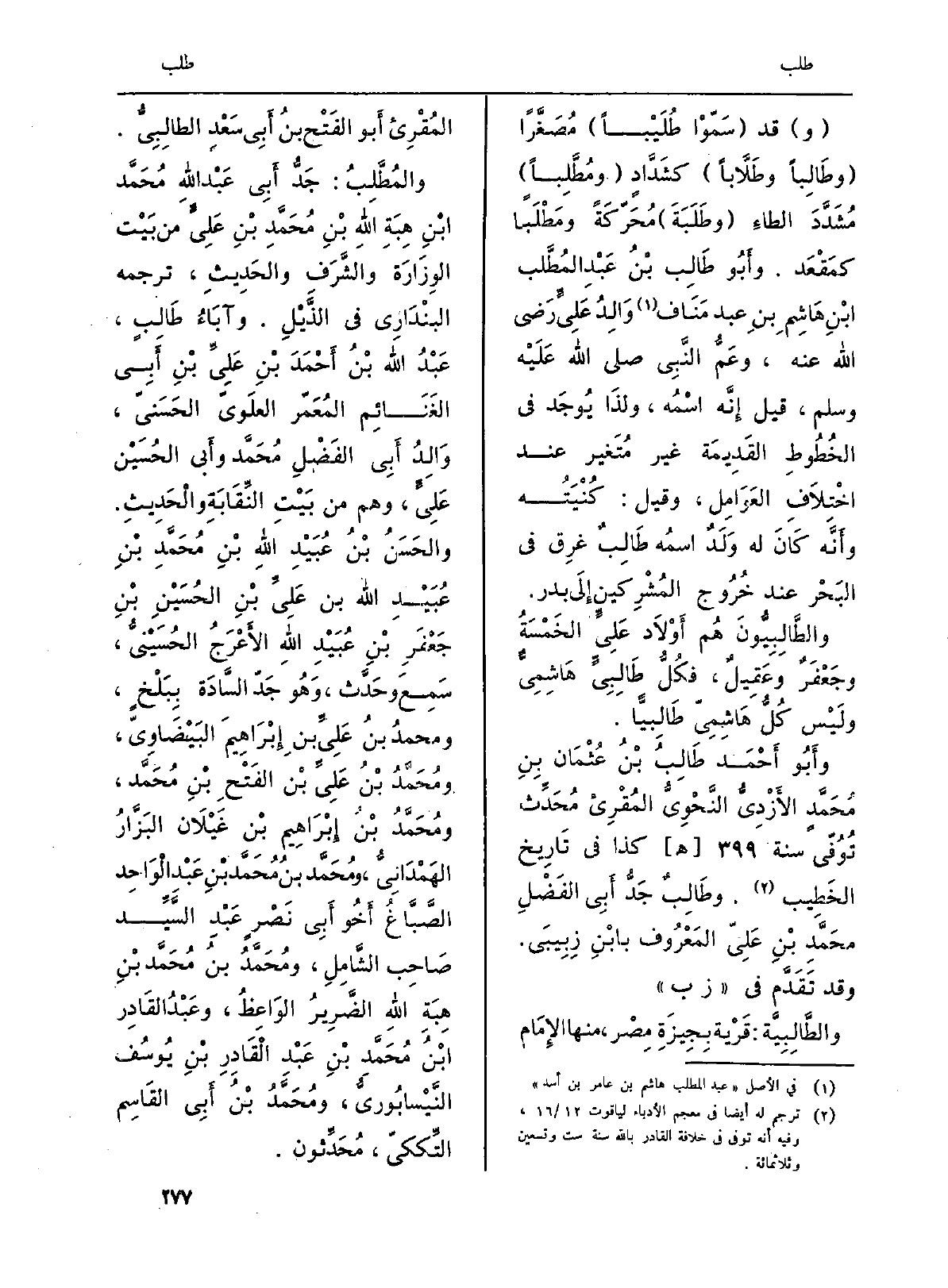 والمُطَّلِبُ: جَدُّ أَبِي عَبْد اللهِ مُحَمَّد بْنِ هِبَةِ اللهِ بْنِ مُحَمَّدِ بْنِ عَلِيَ من بَيْت الوِزَارَة والشَّرَفِ والحَدِيثِ، تَرْجمهُ البنْدَاري فِي الذَّيْلِ. وآبَاءُ طَالِبٍ، عَبْدُ الله بْنُ أَحْمَدَ بْنِ عَلِيِّ بْنِ أَبِي الغَنَائِم المُعَمّر العلَويّ الحَسَنيّ، وَالِدُ أَبِي الفَضْلِ مُحَمَّد وأَبي الحُسَيْن عَلِيَ، وهم من بيْتِ النِّقَابَةِ والْحَدِيثِ. والحَسَنُ بْنُ عُبَيْدِ اللهِ بْنِ مُحَمَّدِ بْنِ عُبَيْدِ الله بن عَلِيِّ بْنِ الحُسَيْنِ بْنِ جَعْفَرِ بْنِ عُبَيْدِ اللهِ الأَعْرَجُ الحُسَيْنيُّ، سَمِعَ وحَدِّث، وَهُو جَدّ السَّادَة بِبَلْخَ، ومحمدُ بنُ عَلِيِّ بنِ إِبْرَاهِيمَ البَيْضَاوِيّ، ومُحَمَّدُ بْنُ عَلِيِّ بْن الفَتْحِ بْنِ مُحَمَّد ومُحَمَّدُ بْنُ إِبْرَاهِيم بْن غَيْلَان البَزَّارُ الهَمْدَانِيُّ، ومُحَمَّد بنُ مُحَمَّد بْنِ عَبْد الْوَاحِد الصبَّاغُ أَخُو أَبِي نَصْرٍ عَبْدِ السَّيِّد صَاحِب الشَّامِلِ، ومُحَمَّدُ بنُ مُحَمَّد بْنِ هِبَةِ اللهِ الضَّرِيرُ الوَاعِظُ، وعَبْدُ القَادِر بْنُ مُحَمَّدِ بْنِ عَبْدِ الْقَادِرِ بْنِ يُوسُف النَّيْسابُوريُّ، ومُحَمَّدُ بْنُ أَبِي القَاسِم التِّككيّ، مُحَدِّثون.
