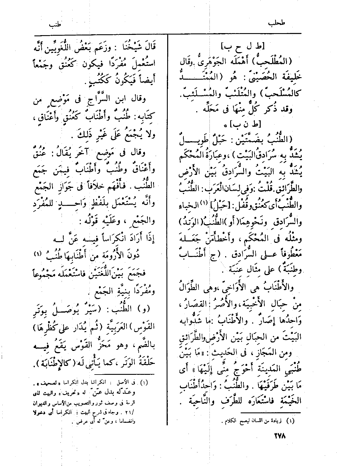 : (الطُّنُبُ بضَمَّتَيْن: حَبْلٌ طَوِيلٌ يُشَدُّ بِهِ سُرَادِقُ البَيْتِ) ، وعِبَارَةُ المُحْكَم يُشَدُّ بِهِ البَيْتُ والسُّرَادِقُ بَيْن الأَرْضِ والطَّرَائِق. قُلْتُ: وَفِي لِسَان الْعَرَب: الطُّنُبُ والطُّنْبُ أَي عُنُق وقُفْل: (حَبْلُ) الخِباءِ والسُّرَادِقِ ونَحْوِهِمَا (أَو) الطُّنُبُ (الوَتِدُ) ومثْلُه فِي المُحْكَم، وأَخْطأَ مَنْ جَعَلهَ مَعْطُوفاً على السُّرَادِق. (ج أَطْنَابٌ وطِنَبَةٌ) على مِثَال عِنَبَة.