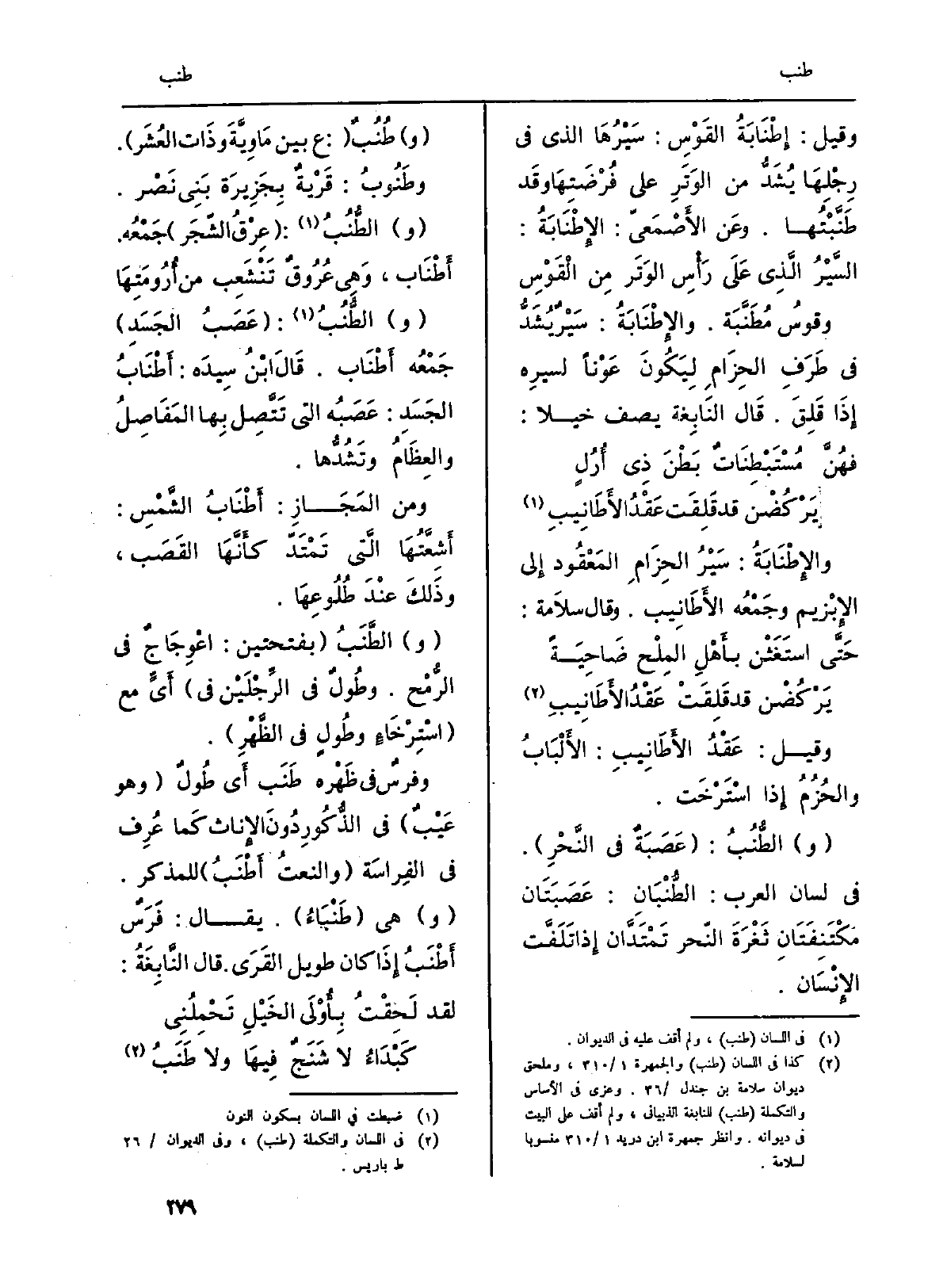 (و) الطُّنُبُ: (عَصَبَةٌ يالنَّحْرِ) . فِي لِسَان الْعَرَب: الطُّنْبَانِ: عَصَبَتَن مَكْتَنِفَتَانِ ثَغْرَةَ النّحر تَمْتَدَّان إِذا تَلَفَّت الإِنْسَان.