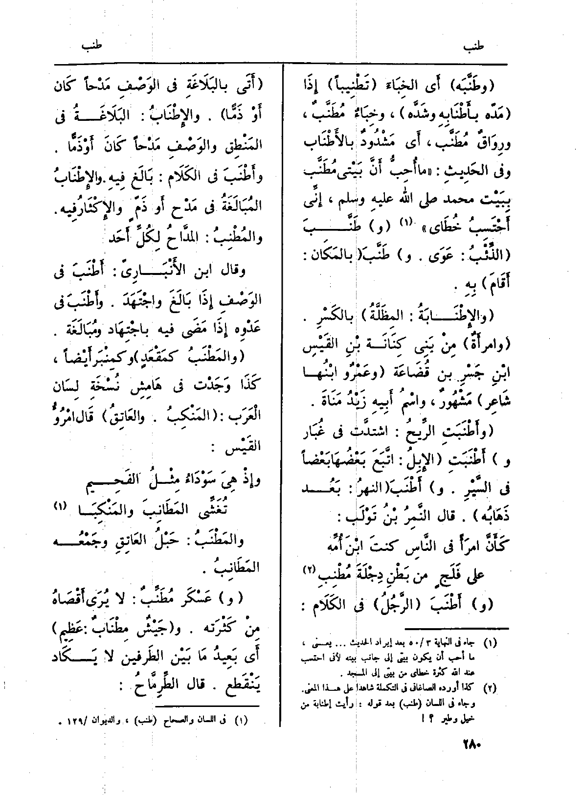 (و) أَطْنَبَ (الرَّجُلُ) فِي الكَلَام: (أَتى بالبَلَغَةِ فِي الوَصْفِ مَدْحاً كَان أَوْ ذَمًّا) . والإِظْنَابُ: البَلَاغَةُ فِي المَنْطِق والوَصْفِ مَدحاً كَانَ أَوْ ذَمًّا. وأَطْنَبَ فِي الكَلَام: بَالَغ فِيهِ. والإِطْنَابُ المُبَالَغَةُ فِي مدْح أَو ذَمَ والإِمْثَارُ فِيه. والمُطْنِبُ: المدَّاحُ لِكُلِّ أَحَد.