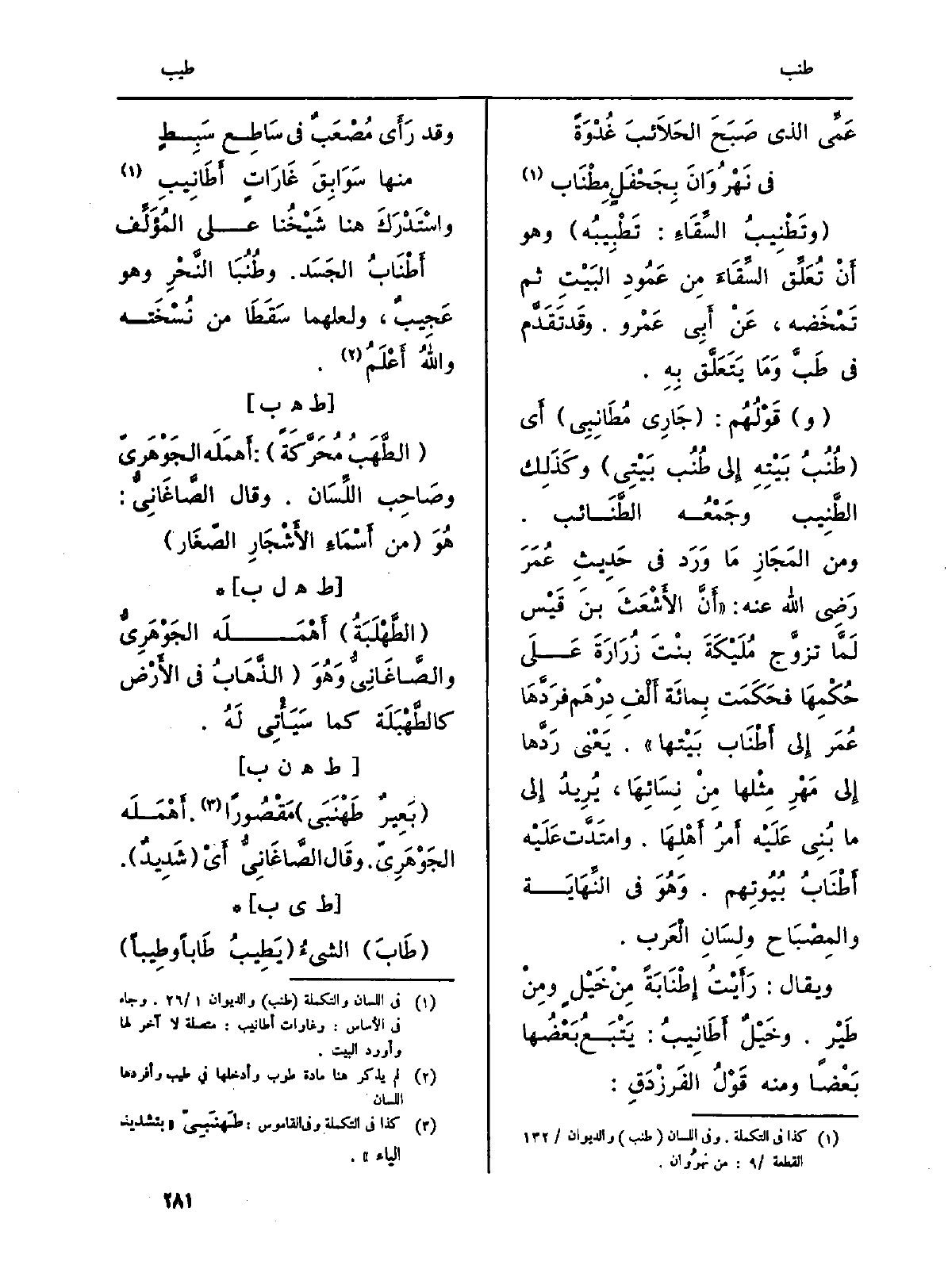 (و) قَوْلُهُم: (جَارِي مُطَانِبِي) أَي (طُنُبُ بَيْتِهِ إِلى طُنُب بَيْتِي) وكَذَلِك الطَّنِيب وجَمْعُه الطَّنَائب.