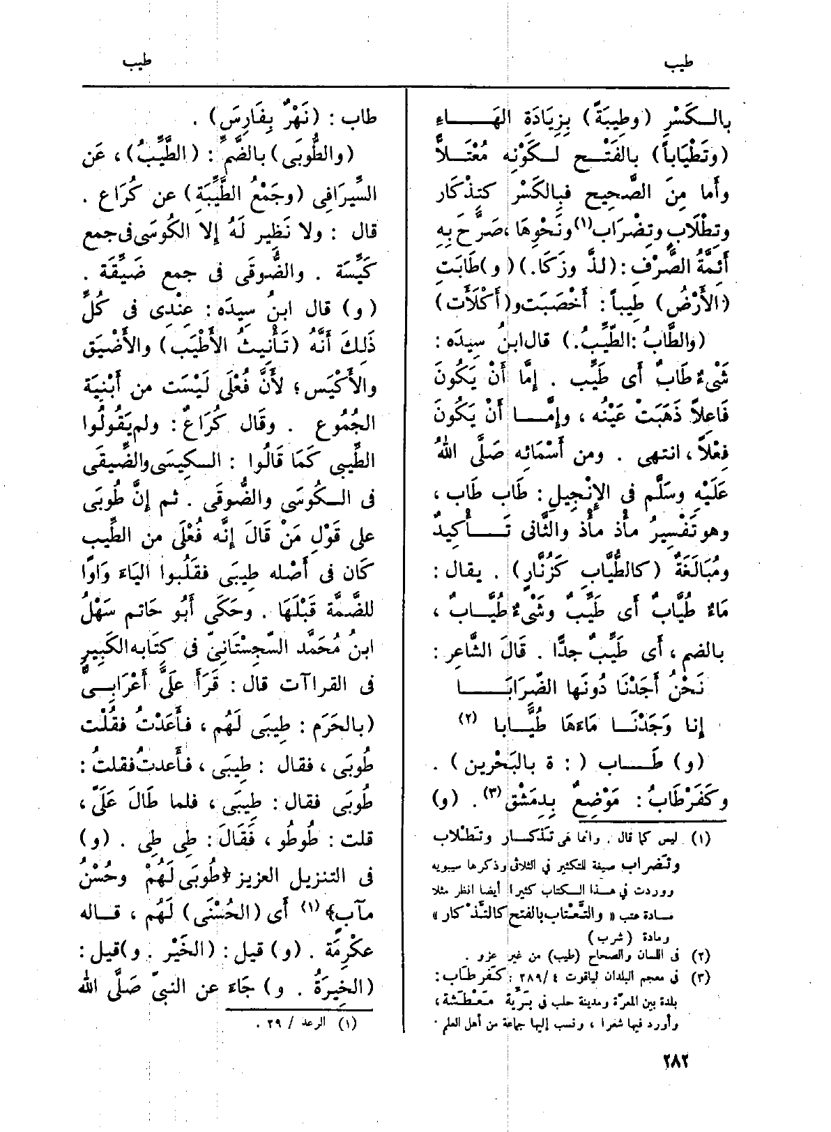 (} والطُّوبَى) بالضَّمِّ: ( {الطَّيِّبُ) ، عَن السِّيرَافِي (وجَمْعُ} الطَّيِّبَة) عَن كُرَاع. قَالَ: وَلَا نَظير لَهُ إِلا الكُوسَى فِي مَعَ كَيِّسَة. والضُّوقَى فِي جمع ضَيِّقَة. (و) قَالَ ابنُ سِيدَه: عنْدي فِي كُلِّ ذَلِكَ أَنَّهُ (تَأْنِيثُ {الأَطْيَب) والأَضْيَق والأَكْيَس؛ لأَنَّ فُعْلَى لَيْسَت من أَبْنيَة الجُمُوع. وقَال كُرَاعٌ: وَلم يَقُولُوا الطِّيبى كَمَا قَالُوا: الكِيسَى والضِّيقَى فِي الكُوسَى والضُّوقَى. ثمَّ إِنَّ طُوبَى على قَوْل مَنْ قَالَ إِنَّه فُعْلَى من الطِّيب كَان فِي أَصْله} طِيبَى فقَلُبوا ليَاءَ وَاواً للضَّمَّة قَبْلَهَا. وحَكَى أَبو حَاتم سَهْلُ بْنُ مُحَمَّد السّجِسْتَانِيّ فِي كِتَابه الكَبِيرِ فِي الْقرَاءَات قَالَ: قَرَأَ عَليَّ أَعْرَابِيٌّ (بالحَرَم: طِيبَى لَهُم، فأَعَدْتُ فقُلْت طُوبَى، فَقَالَ: طِيبَى، فأَعدتُ فقلتُ: طُوبَى فَقَالَ: طِيبَى، فَلَمَّا طَالَ عَلَيّ، قلت: طُوطُو، فَقَالَ: طِي طِي. (و) فِي التَّنْزِيل الْعَزِيز {طُوبَى لَهُمْ وَحُسْنُ مَئَابٍ} (الرَّعْد: 29) أَي (الحُسْنَى) لَهُم، قَالَه عكْرِمَة (و) قيل: (الخَيْر. و) قيل: (الخِيرَةُ. و) جَاءَ عَن النبيّ صَلَّى الله