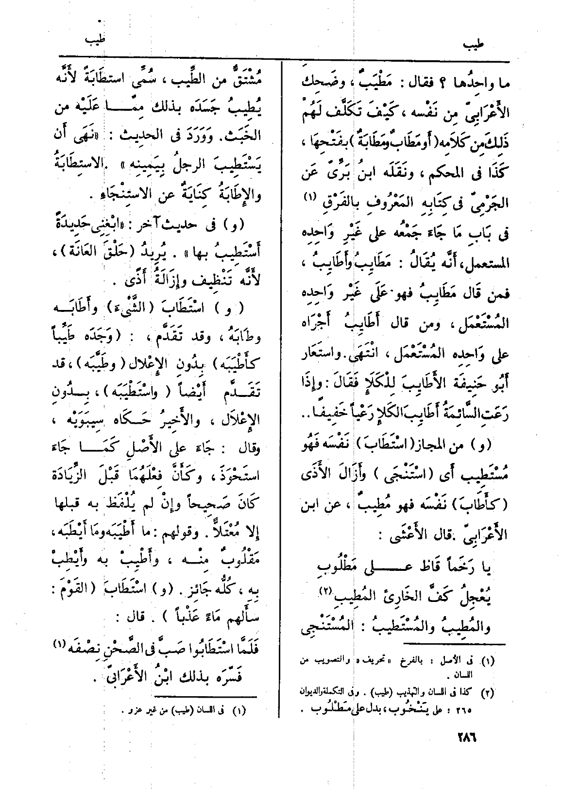 مَا واحِدها؟ فَقَالَ: {مَطْيَبٌ، وضَحِكَ الأَعْرَابِيّ مِن نَفْسه، كَيْفَ تَكَلَّف لَهُمْ ذَلِكَ مِن كَلَامِه (أَو} مَطَابٌ {ومَطَابَةٌ) بفَتْحِهَا، كَذَا فِي الْمُحكم، ونَقَلَه ابنُ بَرِّيّ عَن الجَرْمِيّ فِي كِتَابِهِ المَعْرُوفِ بالفَرْقِ فِي بَابِ مَا جَاءَ جَمْعُه على غَيْرِ وَاحِدِه الْمُسْتَعْمل، أَنَّه يُقَالُ: مَطَايِبُ وأَطَايِبُ، فَمن قَال مَطَايِبُ فَهُوَ عَلَى غَيْر واحِدِه المُسْتَعْمَل، وَمن قَالَ أَطَايِبُ أَجْرَاه على وَاحِدِه المُسْتَعْمَل، انْتَهَى. واستَعَار أَبُو حَنِيفَة الأَطَايبَ لِلْكَلَإِ فَقَالَ: وإِذَا رَعَتِ السَّائِمَةُ أَطَايبَ الكَلإِ رَعْياً خَفِيفاً. .