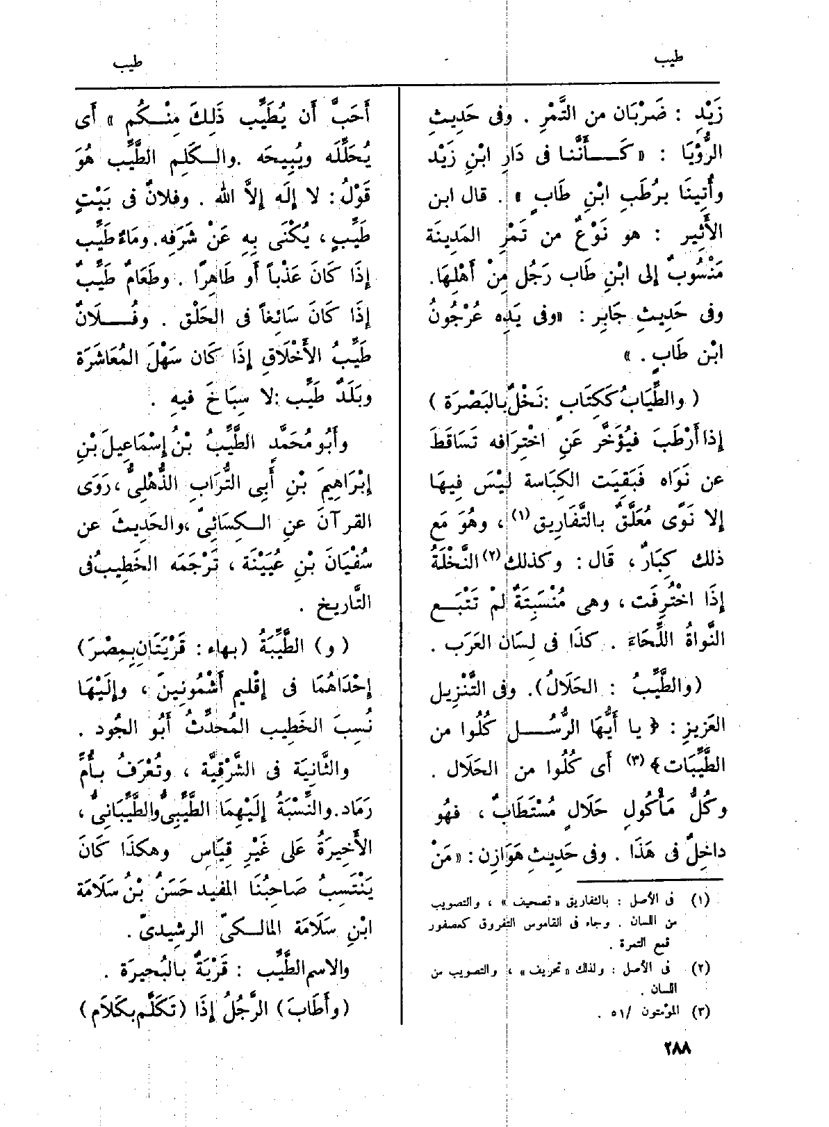 (والطَّيِّبُ: الحَلَالُ) . وَفِي التَّنْزِيل العَزيزِ: {يأَيُّهَا الرُّسُلُ كُلُواْ مِنَ} الطَّيّبَاتِ} (الْمُؤْمِنُونَ: 51) أَي كُلُوا من الحَلَال. وكُلُّ مَأْكُولٍ حَلَالٍ {مُسْتَطَابٌ، هُو داخِلٌ فِي هَذَا. وَفِي حَدِيثِ هَوَازِن: (مَنْ أَحَبَّ أَن يُطَيِّب ذَلِكَ مِنْكُم) أَي يُحَلِّلَه ويُبِيحَه. الكَلِم الطَّيِّب هُوَ قَوْلُ: لَا إلَه إلَّا الله. وفلانٌ فِي بَيْتٍ طَيِّبٍ، يُكْنَى بِهِ عَنْ شَرَفِه. ومَاءٌ طَيِّب إِذَا كَانَ عَذْباً أَو طَاهِراً. وطَعَامٌ طَيِّبٌ إِذَا كَانَ سائِغاً فِي العلْق. وفُلَانٌ طَيِّبُ الأَخْلَاقِ إِذَا كَان سَهْلَ المُعَاشَرَ وبَلَدٌ طَيِّب: لَا سِبَاخَ فيهِ.