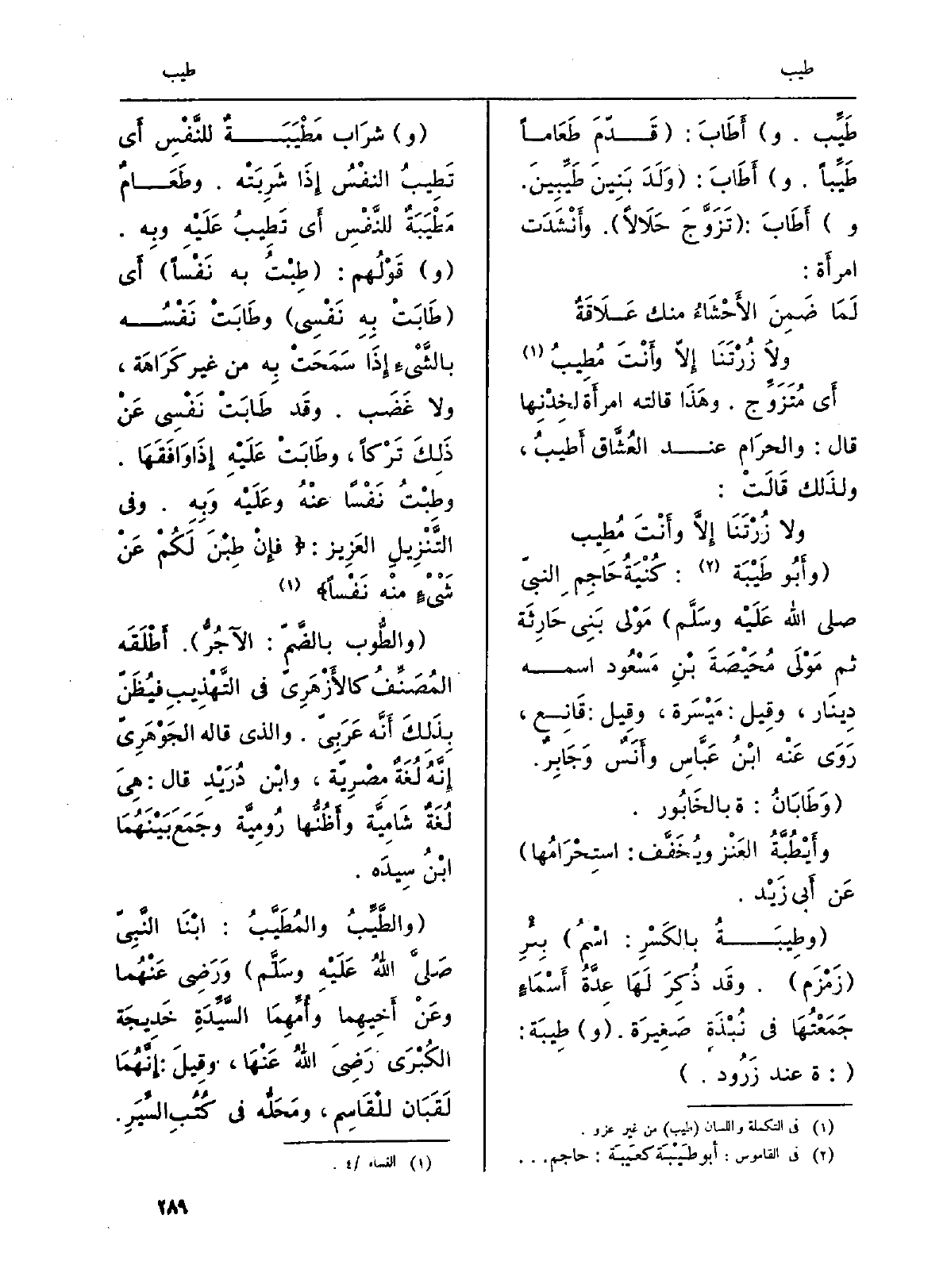 (و) شرَاب} مَطْيَبَةٌ للنَّفْسِ أَي تَطِيبُ النفْسُ إِذَا شَرِبَتْه. وطَعَامٌ مَطْيَبَةٌ للنَّفْسِ أَي تَطِيبُ عَلَيْهِ وبِه. (و) قَوْلُهم: ( {طِبْتُ بِهِ نَفْساً) أَي (} طَابَتْ بِهِ نَفْسِي) {وطَابَتْ نَفْسُه بالشَّيْءِ إِذَا سَمَحَتُ بهِ من غير كَرَاهَة، وَلَا غَضَب. وقَد طَابَتْ نَفْسِي عَنْ ذَلِكَ تَرْكاً، وطَابَتْ عَلَيْهِ إِذَا وَافَقَهَا. وطِبْتُ نَفْساً عنْهُ وعَلَيْه وَبِهِ. وَفِي التَّنْزِيلِ العَزِيز: {فَإِن} طِبْنَ لَكُمْ عَن شَىْء مّنْهُ نَفْساً} (النِّسَاء: 4) .