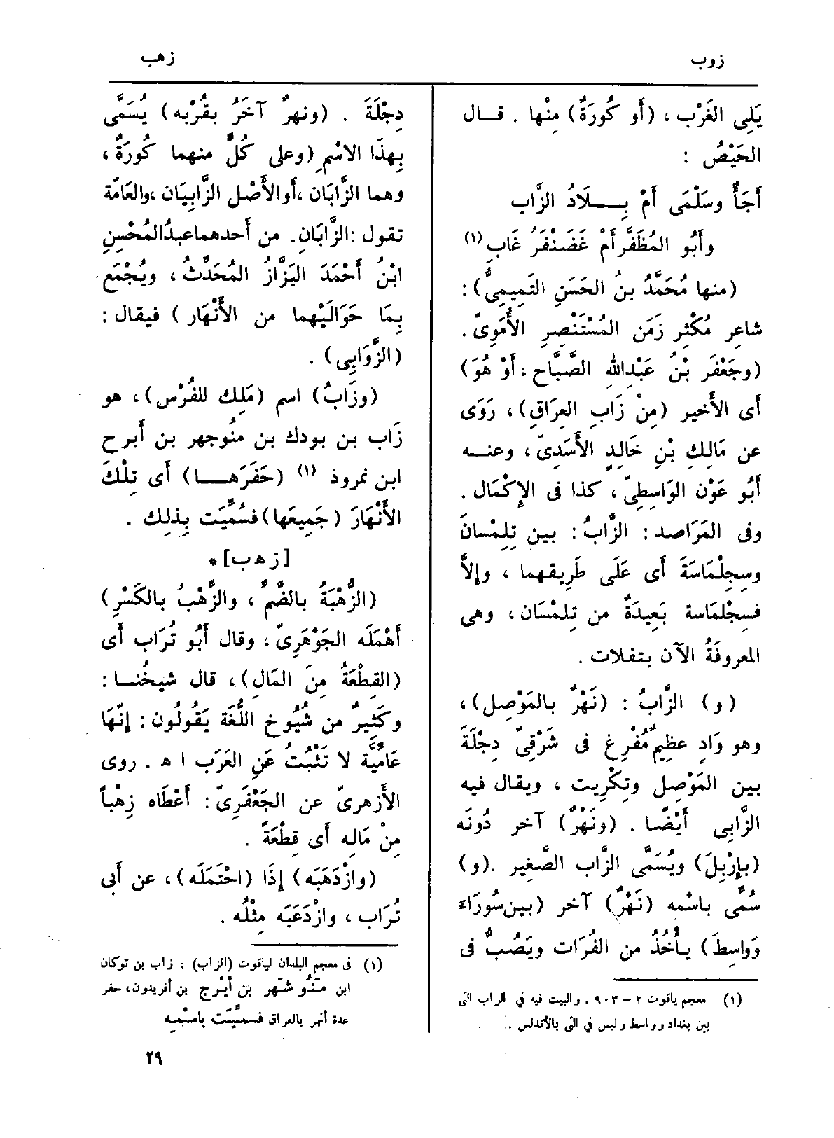 (و) الزَّابُ: (نَهْرٌ بالمَوْصِل) ، وَهُوَ وَادٍ عظِيمٌ مُفْرِغ فِي شَرْقِيّ دِجْلَةَ بَين المَوْصِل تِكْرِيت، وَيُقَال فِيهِ {- الزَّابِي أَيْضاً. (ونَهْرٌ) آخر دُونَه (بإِربِلَ) ويُسَمَّى الزَّاب الصَّغِير. (و) سُمِّي باسْمه (نَهْرٌ) آخر (بَين سُورَاءَ وَواسِطَ) يأْخُذُ من الفُرَات ويَصُبُّ فِي دِجْلَةَ. (ونهرٌ آخَرُ بقُرْبة) يُسَمَّى بِهذَا الاسِمْ (وعَلى كُلَ مِنْهُمَا كُورَةٌ، وهما} الزَّابَان، أَو الأَصْل {الزَّابِيَان، والعَامّة تَقول: الزَّابَانِ. من أَحدهما عبدُ المُحْسِنِ بْنُ أَحْمَدَ البَزَّازُ المْحَدِّثُ، ويُجْمَع بِمَا حَوَالَيْها من الأَنهَار) فَيُقَال: (} - الزَّوَابِي) .
