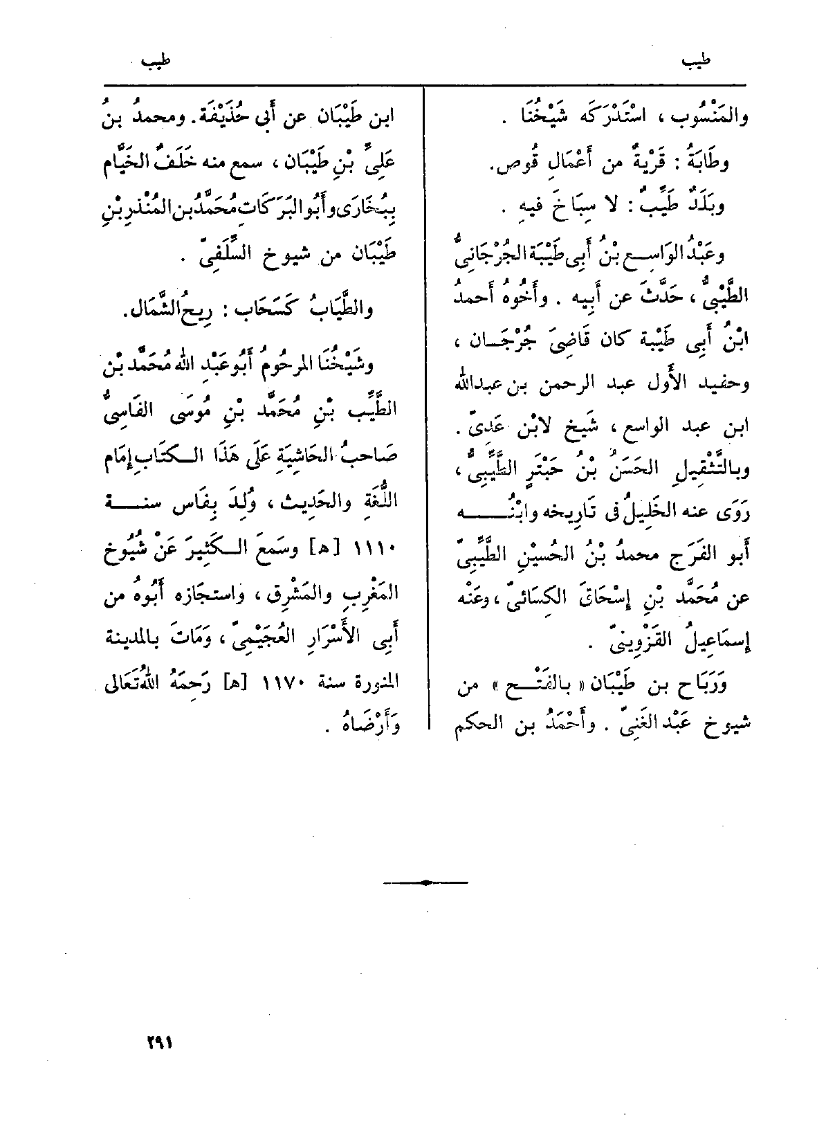 وَرَبَاح بن! طَيْبَان (بالفَتْح) من شُيُوخ عَبْد الفَنِيّ. وأَحْمَدُ بن الحكم بن طَيْبَان عَن أَبي حُذَيْفَة. ومحمدُ بنُ علِيِّ بْنِ طَيْبَان، سمع مِنْهُ خَلَفٌ الخَيَّام بِبُخَارَى وأَبُو البَرَكَات مُحمَّدُ بن المُنْذرِ بْنِ طَيْبَان من شُيُوخ السِّلَفِيّ.