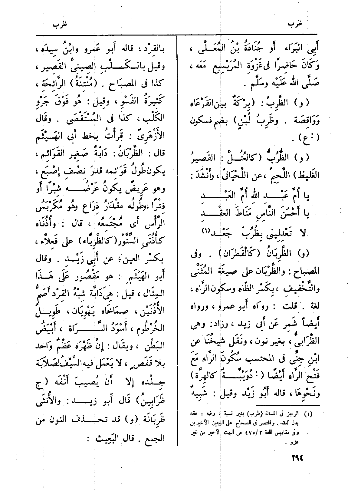(و) الظَّرِبَانُ (كَالْقَطَرَان) . وَفِي الْمِصْبَاح: والظِّرْبَان على صيغَة المُثَنَّى والتَّخْفيف، بِكَسْر الظّاءِ وَسُكُون الرَّاءِ، لُغَة. قلت: روَاه أَبو عَمْرو، وَرَوَاهُ أَيضاً شَمر عَن أَبي زيد، وَزَاد: وَهِي الظَّرَابِيّ، بِغَيْر نون، ونَقَل شيخُنَا عَن ابْنِ جِنِّي فِي الْمُحْتَسب سُكُونَ الرَّاءِ مَعَ فَتْح الرَّاءِ مَعَ فَتْح الرَّاءِ أَيْضاً: (دُوَيْبَّةٌ كالهِرَّة) ونَحْوِهَا، قَالَه أبُو زَيْد وَقيل: شَبِيهٌ بالقِرْد، قَالَه أَبو عَمرو وابْنُ سِيدَه. وَقيل بالكَلْبِ الصِينِيِّ القَصِير. كَذَا فِي المصبَاح. (مُنْتنَةُ) الرَّائِحَةِ، كَثِيرَةُ الفَسْوِ، وقِيل: هُو فَوْقَ جَرْوِ الكَلْب، كَذَا فِي المُسْتَقْصَى. وقَال الأَزْهَرِيّ: قَرأْتُ بِخَط أَبي الهَيثَم قَالَ: الظِّرْبَانُ: دَابْةٌ صَغِير القَوَائم، يكون طُولُ قَوَائمه قدرَ نصْف إِصْبَع، وَهُوَ عَرِيضٌ يكونُ عَرْضُه شِبْراً أَو فِتْراً، وطُولُه مقْدَارُ ذِرَاع وهُو مُكَرْبَسُ الرَّأْس أَي مُجْتَمِعُه، قَالَ: وأُذُنَاه كأُذُنَيِ السِّنَّوْر (كالظَّرِبَّاء) على فَعلَّاء، بكسْر الْعين؛ عَن أَبِي زَيْد. وَقَالَ أَبو الهَيْثَمِ: هُوَ مَقْصُور عَلَى هَذَا المِثَال، قيل: هِي دَابَّة شبْهُ القرْد أَصَمُّ الأُذُنَيْن، صمَاخَاه يَهوِيَان، طَوِيلُ الخُرْطُوم، أَسْوَدُ السَّرَاة، أَبْيَضُ البَطْن، ويقَال: إِنَّ ظَهْرَه عَظْمٌ وَاحد بِلَا قَفَصٍ، لَا يَعْمَل فِيهِ السَّيْفُ لصَلَابَة جِلْده إِلَّا أَن يُصيبَ أَنْفَه (ج ظَرَابِينُ) قَال أَبو زيد: والأُنثَى ظَربَانَة (و) قد تحذف النُّون من الْجمع. قَالَ البَعِيث:
