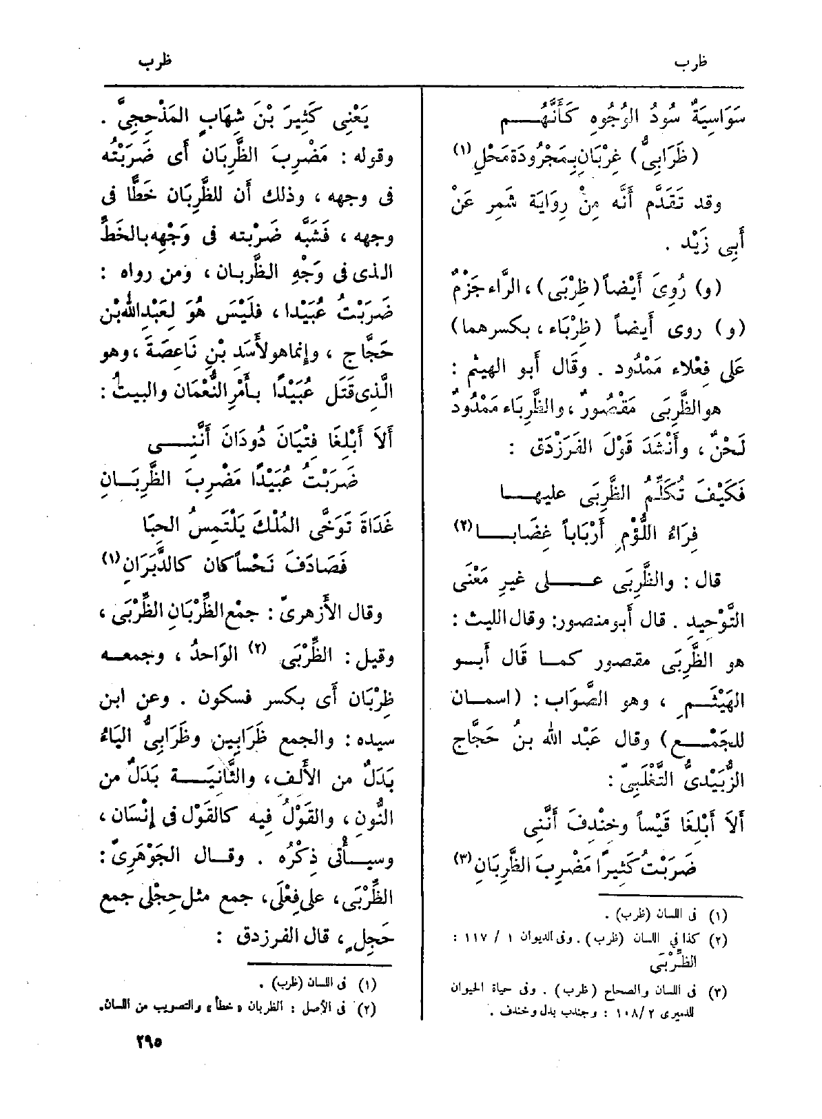 قَالَ: والظَّرِبَى على غيرِ مَعْنَى التَّوْحِيدِ. قَالَ أَبو مَنْصُور: وَقَالَ اللَّيْث: هُوَ الظَّرِبَى مَقْصُور كَمَا قَال أَبو الهَيْثَمِ، وَهُوَ الصَّوَاب: (اسمان للجَمْع) وَقَالَ عَبْد الله بنُ حَجَّاج الزُّبَيْديُّ التَّغّلَبِيّ: