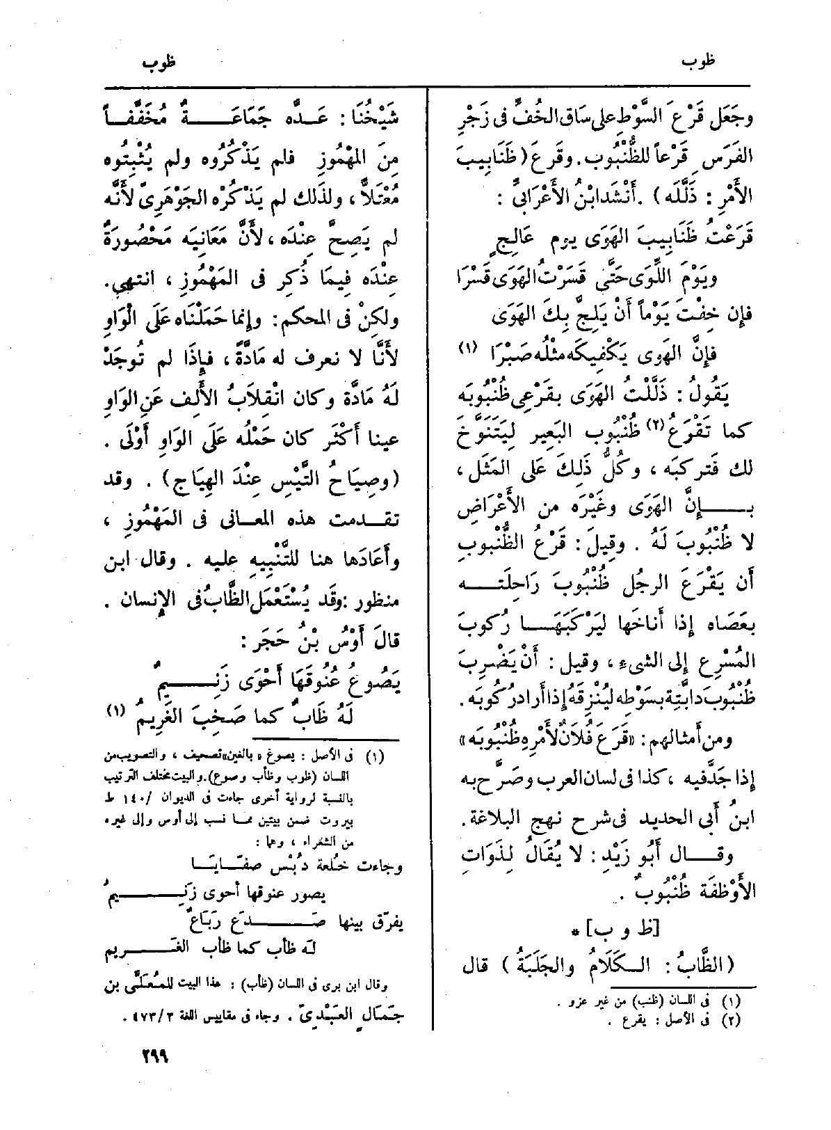 : ( {الظَّابُ: الكَلَامُ والجَلَبَةُ) قَالَ شَيْخُنَا: عَدَّه جَمَاعَةٌ مُخَفَّفاً مِنَ المهْمُوزِ فَلم يَذْكُرُوه وَلم يُثْبِتُوه مُعْتَلًّا ولذَلك لم يَذْكُرْه الجَوْهَرِيّ لأَنَّه لم يَصِحَّ عِنْدَه، لأَنَّ مَعَانِيَه مَحْصُورَةٌ عِنْدَه فِيمَا ذُكِر فِي المَهْمُوزِ، انْتهى. ولكِنْ فِي الْمُحكم: وَإِنَّمَا حَمَلْنَاه عَلَى الْوَاوِ لأَنَّا لَا نَعْرِف لَهُ مَدَّةً، فإِذَا لم تُوجَدْ لَهُ مَادَّة وَكَانَ انْقِلَابُ الأَلِف عَنِ الوَاوِ عينا أَكْثَر كَانَ حَمْلُه عَلَى الوَاوِ أوْلَى. (وصِيَاحُ التَّيْسِ عِنْدَ الهِيَاج) . وَقد تَقدمت هَذِه الْمعَانِي فِي المَهْمُوزِ، وأَعَادَها هُنَا للتَّنْبِيهِ عَلَيْهِ. وَقَالَ ابْن مَنْظُور: وقَد يُسْتَعْمَل الظَّابُ فِي الإِنسان. قالَ أَوْسُ بْنُ حَجَر: