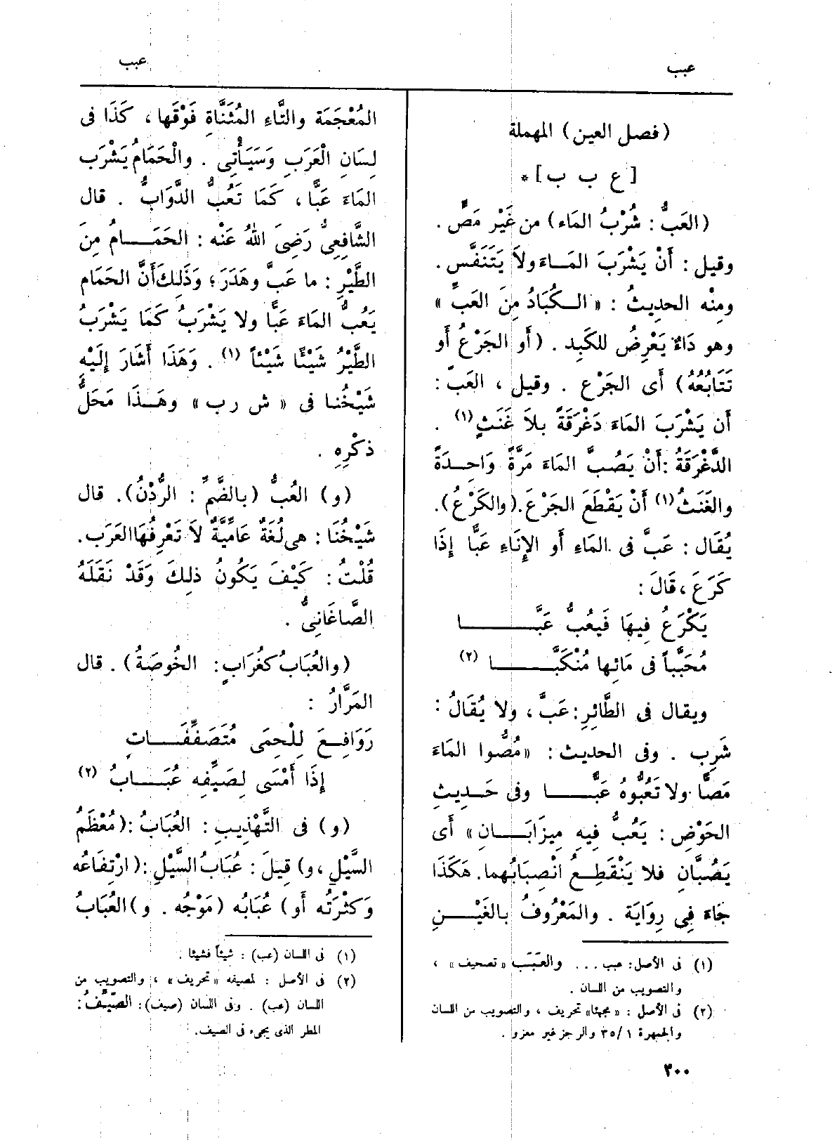 وَيُقَال فِي الطَّائِرِ: عَبَّ، وَلَا يُقَالُ: شَرِب. وَفِي الحَدِيث: (مُصُّوا المَاءَ مَصًّا وَلَا {تَعُبّوهُ عَبًّا وَفِي حَدِيثِ الحَوْضِ:} يَعُبُّ فِيهِ مِيزَابَانِ) أَي يَصُبَّانِ فَلَا يَنْقَطِعُ انْصِبَابُهما. هَكَذَا جَاءَ فِي رِوَايَة. والمَعْرُوفُ بالغَيْنِ المُعْجَمَة والتَّاءِ المُثَنَّاةِ فَوْقَها، كَذَا فِي لِسَانِ الْعَرَبِ وَسَيَأْتِي. والْحَمَامُ يَشْرَب المَاءَ عَبًّا، كَمَا {تَعُبُّ الدَّوَابُّ. قَالَ الشَّافِعِيُّ رَضِيَ اللهُ عَنْه: الحَمَامُ مِنَ الطَّيْرِ: مَا عَبَّ وهَدَرَ؛ وَذَلِكَ أَنَّ الحَمَام يَعُبُّ المَاءَ عبًّا وَلَا يَشْرَبُ كَمَا يَشْرَبُ الطَّيْرُ شَيْئاً شَيْئاً. وَهَذَا أَشَارَ إِلَيْهِ شَيْخُنا فِي (ش ر ب) وهَذَا مَحَلُّ ذكْرِهِ.