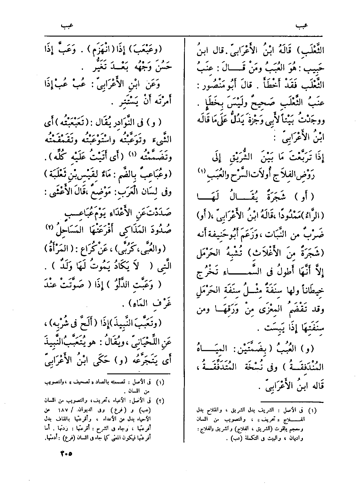 الثَّعْلَبِ) قَالَهُ ابْنُ الأَعْرَابِيّ. قَالَ ابنُ حَبِيب: هُوَ العُبَبُ ومَنْ قَالَ: عِنَبُ الثَّعْلَب فَقَدْ أَخْطَأَ. قالَ أَبُو مَنْصُور: عنَبُ الثَّعْلَبِ صَحِيحٌ ولَيْسَ بِخَطَإٍ. ووجَدْتُ بَيْتاً لأَبِي وَجزْةً يَدُلُّ عَلَى مَا قَالَه ابنُ الأَعْرَابِيّ: