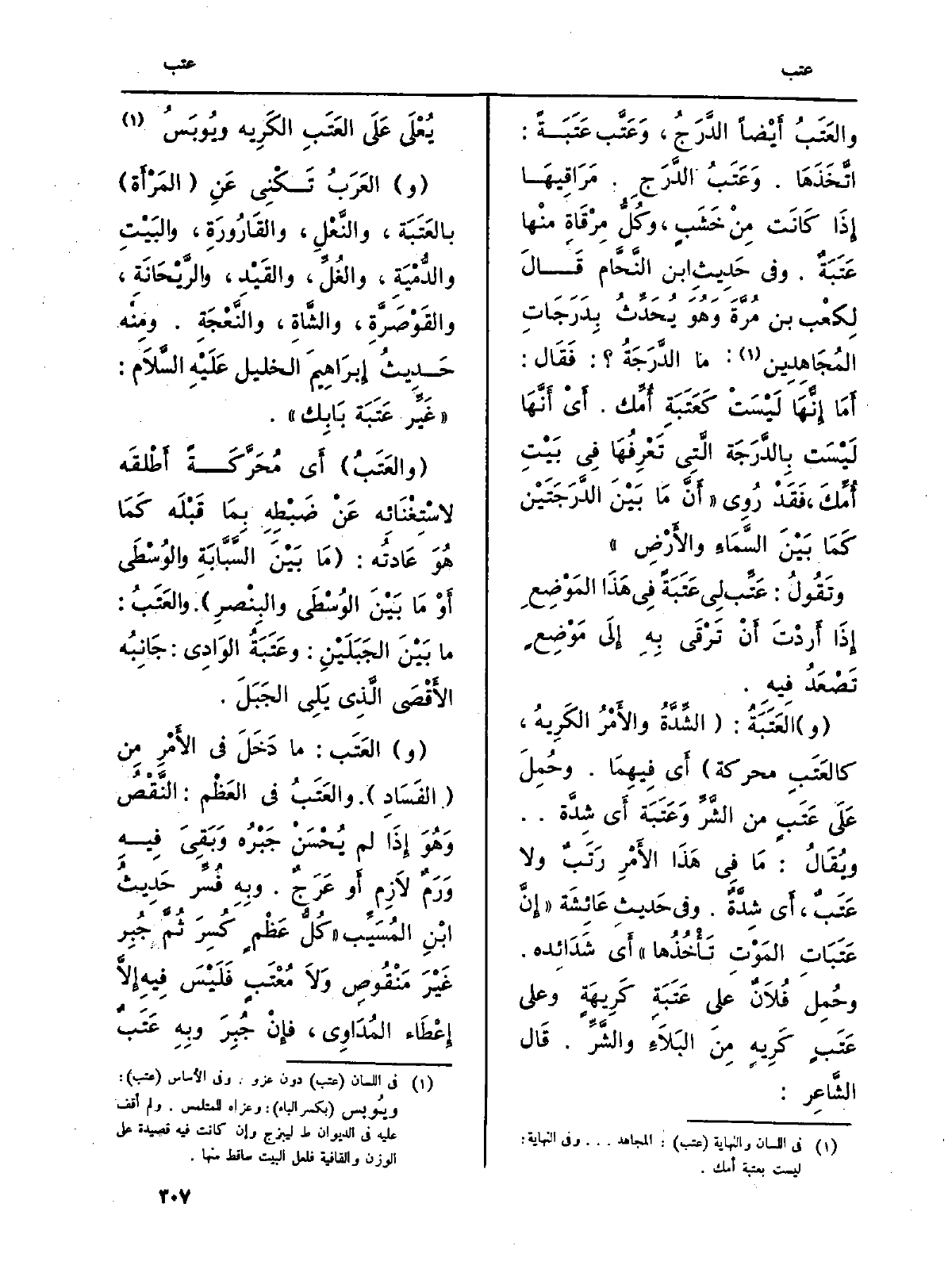 والعَتَبُ أَيْضاً الدَّرَجُ، وَعَتَّب عَتَبَةً: اتَّخَذَهَا. وَعَتَبُ الدَّرَجِ. مَرَاقِيهَا إِذَا كَانَت مِنْ خَشَبٍ. وكُلُّ مِرْقَاةٍ مِنْها عَتَبَةٌ. وَفِي حَدِيثِ ابْن النَّحَّام قَالَ لِكعْب بن مُرَّةَ وَهُوَ يُحَدِّثُ بِدَرَجَاتِ المُجَاهِدِين: مَا الدَّرَجَةُ؟ : فَقَال: أَمَا إِنَّهَا لَيْسَتْ كَعَتَبَةِ أُمِّك. أَيْ أَنَّهَا لَيْسَت بِالدَّرَجَة الَّتِي تَعْرِفُهَا فِي بَيْتِ أُمِّكَ، فَقَدْ رُوِي (أَنَّ مَا بَيْنَ الدَّرَجَتَيْن كَمَا بَنَ السمَاءِ والأَرْضِ) .
