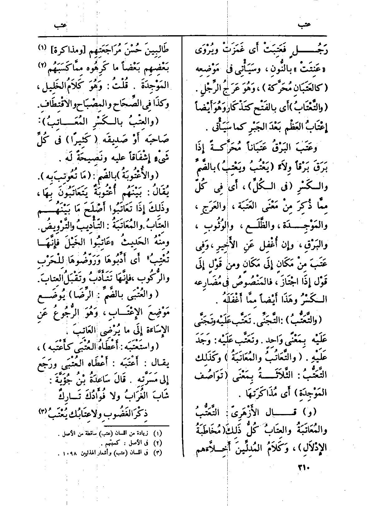 (و) قَالَ الأَزْهَرِيّ: التَّعَتُّبُ والمُعَاتَبَةُ والعِتَابُ كُلُّ ذَلِكَ (مُخَاطَبَةُ الإِدْلَالِ) ، وَكَلَامُ المُدِلِّينَ أَخِلَّاءَهم طَالِبِينَ حُسْنَ مُرَاجَعَتِهِم (ومذاكرة) بَعْضِهِم بَعْضاً مَا كَرِهُوه مِمَّا كَسَبَهُم المَوْجِدَةَ. قُلْتُ: وَهُوَ كَلَامُ الخَلِيل، وكذَا فِي الصِّحَاحِ والمِصْبَاح والاقْتِطَافِ.